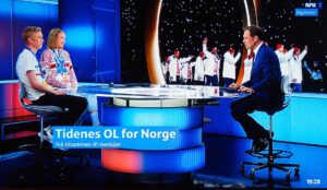 Ragne Wiklund og Jens Lurås Oftebro i NRK-studio. Ragne Wiklund en Jens Lurås Oftebro in de NRK-studio.