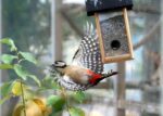 Kanskje han ser matboksen som står i stua? Misschien ziet hij de box met zaad die in de kamer staat?