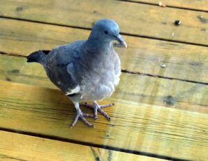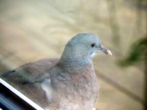 Det er ikke en ringdue, men tam er han! Jeg snakket i norsk og nederlandsk, men det hjelper ikke! Han bare banker for å si: ”La meg inn”! Uff da. Het is geen geringde Duif, maar tam is ie wel! Ik heb hem toegesproken in het Noors en in het Nederlands. Maar dat helpt niet. Hij blijft op het raam kloppen om duidelijk te maken, dat hij naar binnen wil! Oeps dus…