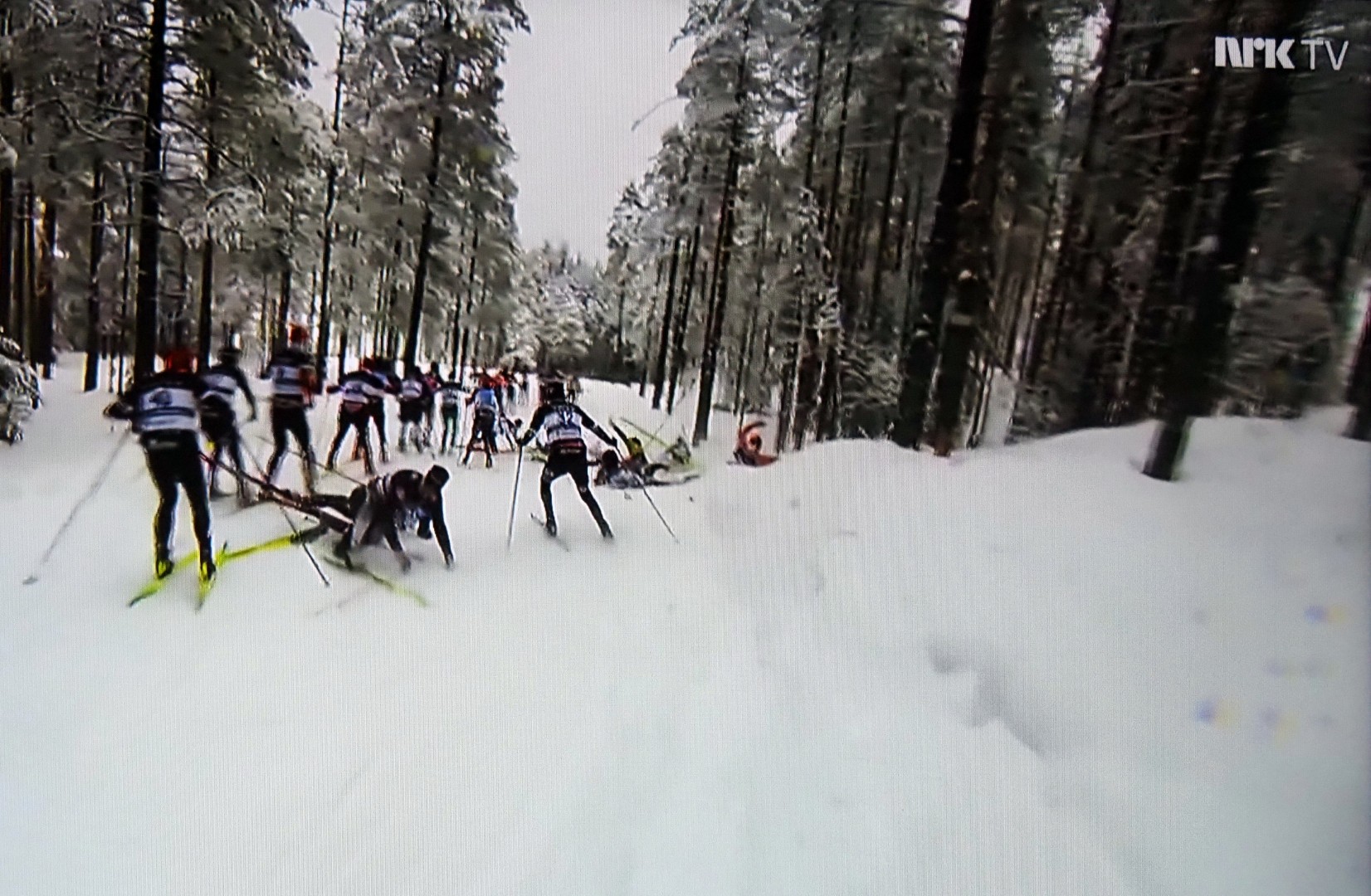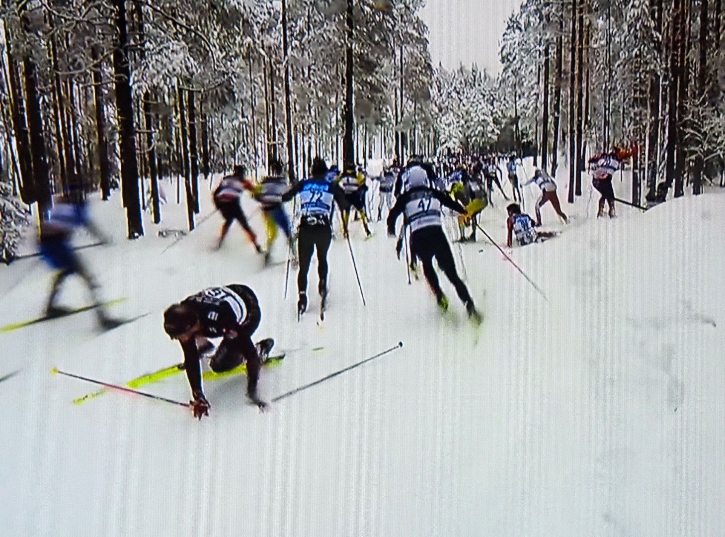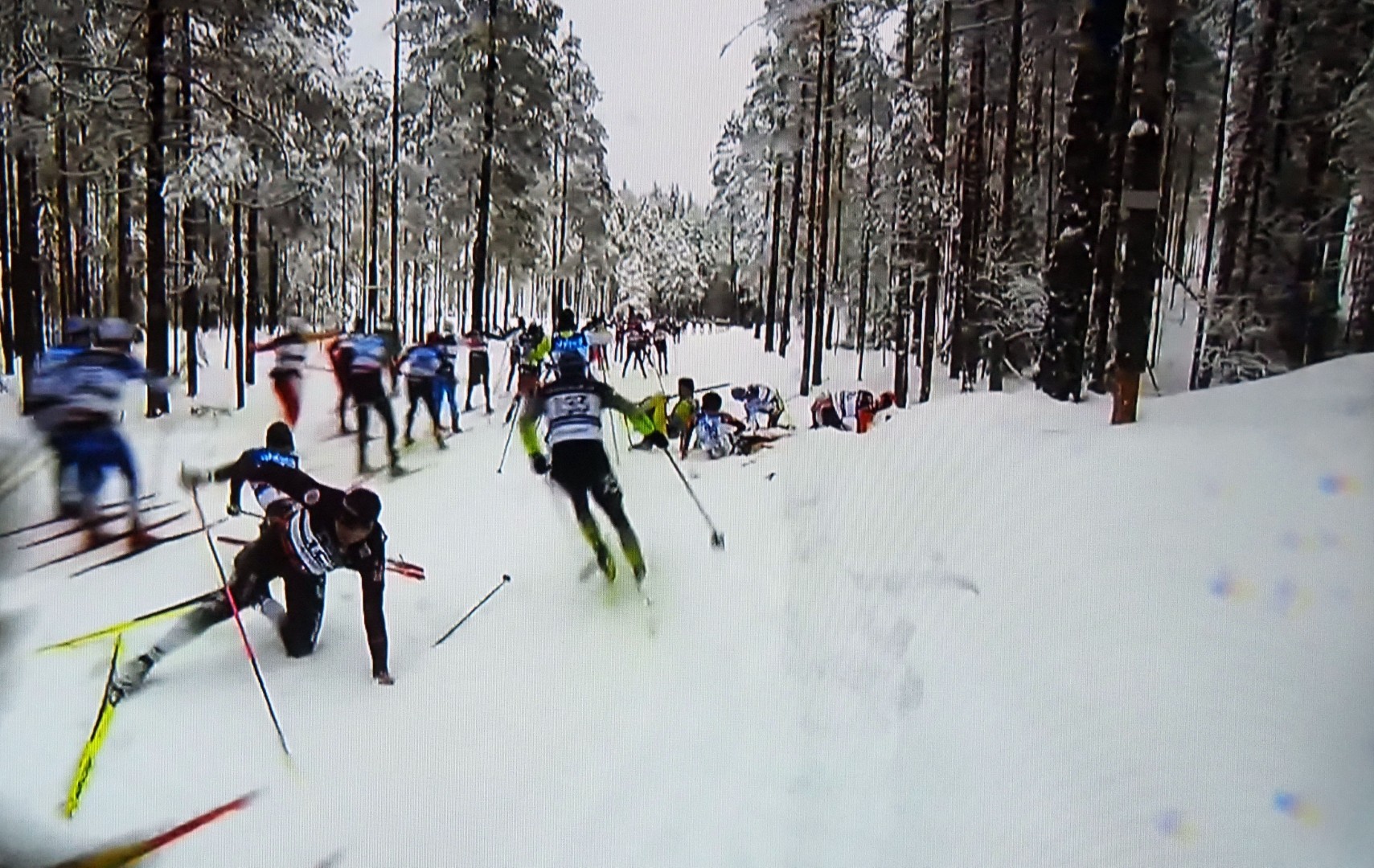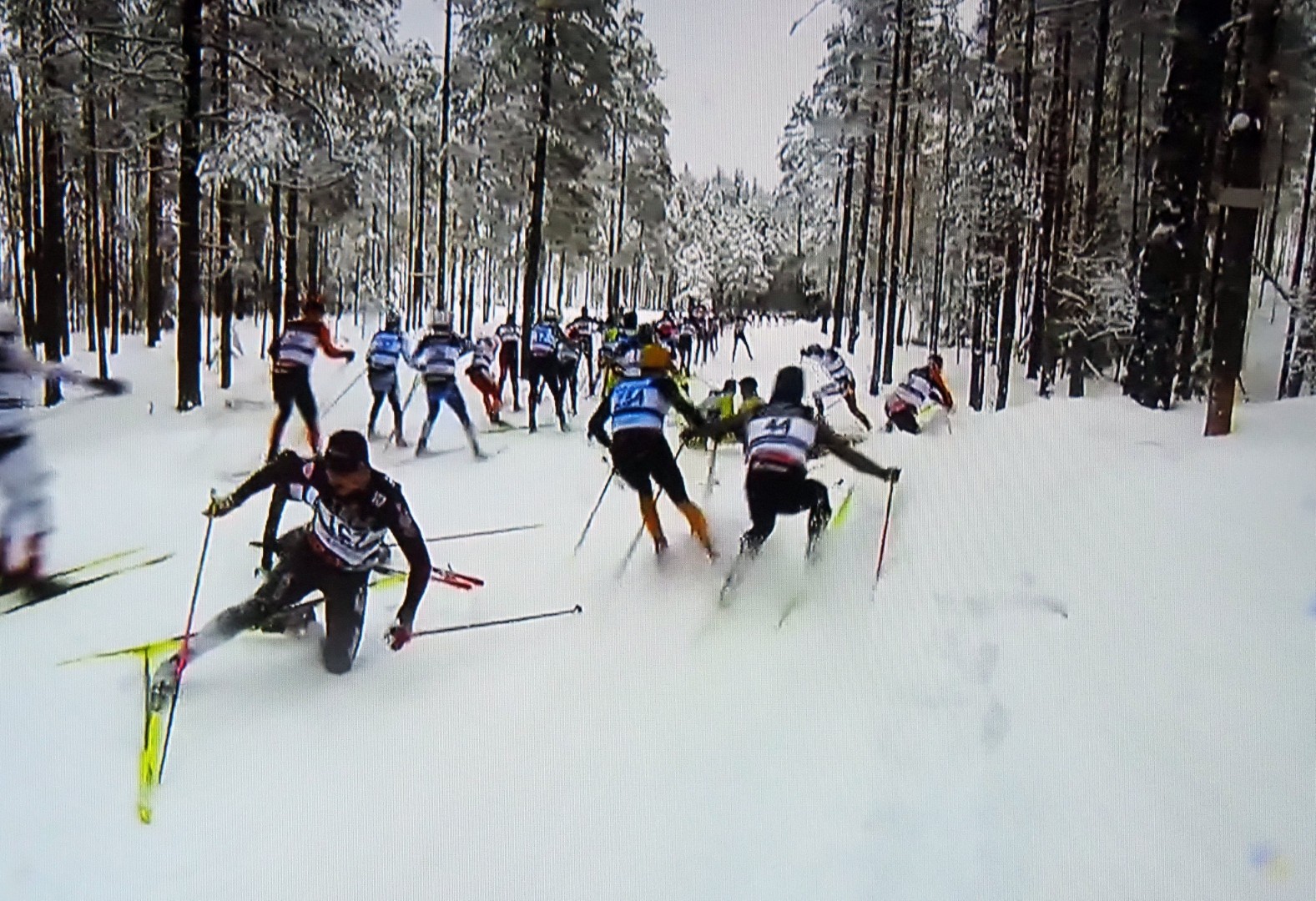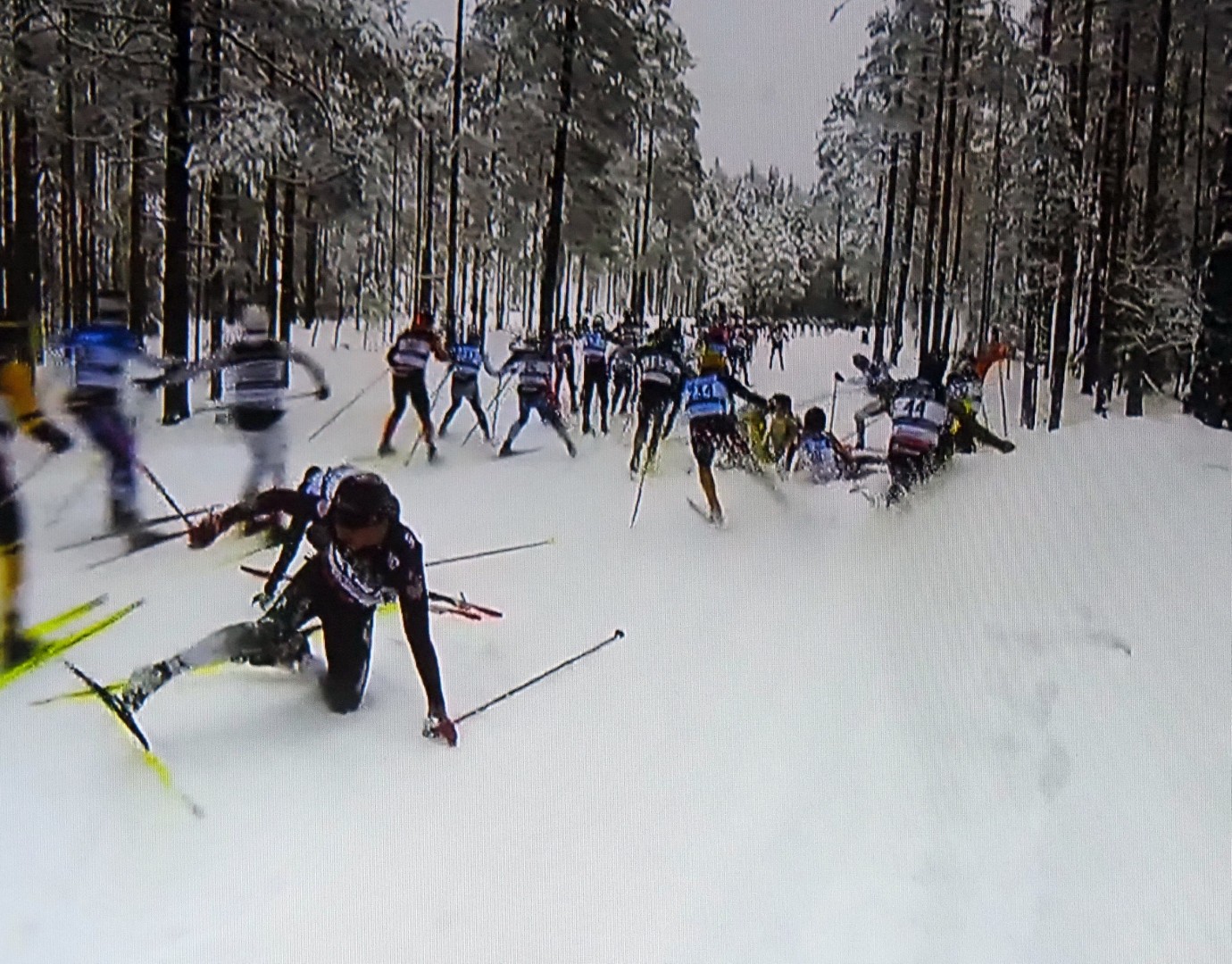 En skiløper faller, den andre også, og kaos oppstår rundt dem. Een skiër valt, de volgende over hem en de rest eindigt in chaos
