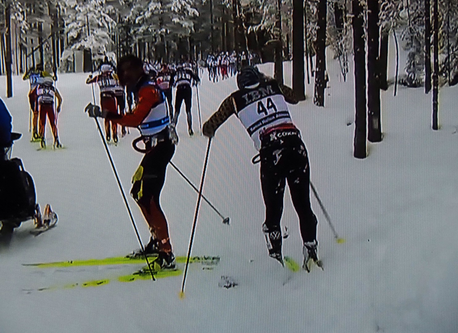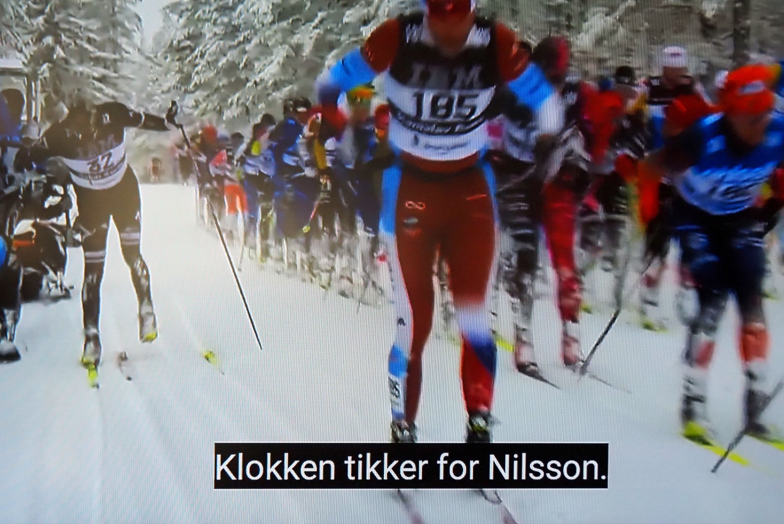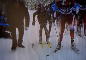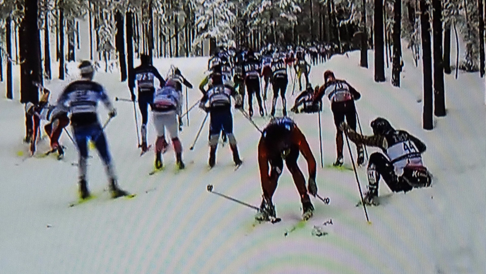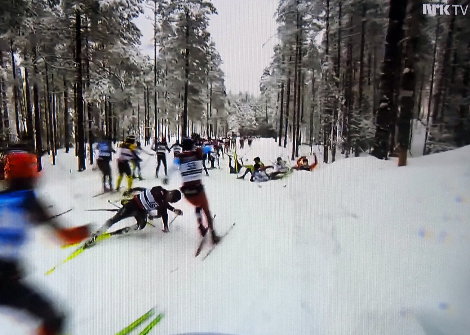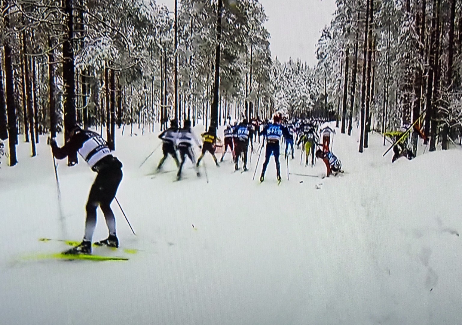 En skiløper faller, den andre også, og kaos oppstår rundt dem. Een skiër valt, de volgende over hem en de rest eindigt in chaos
