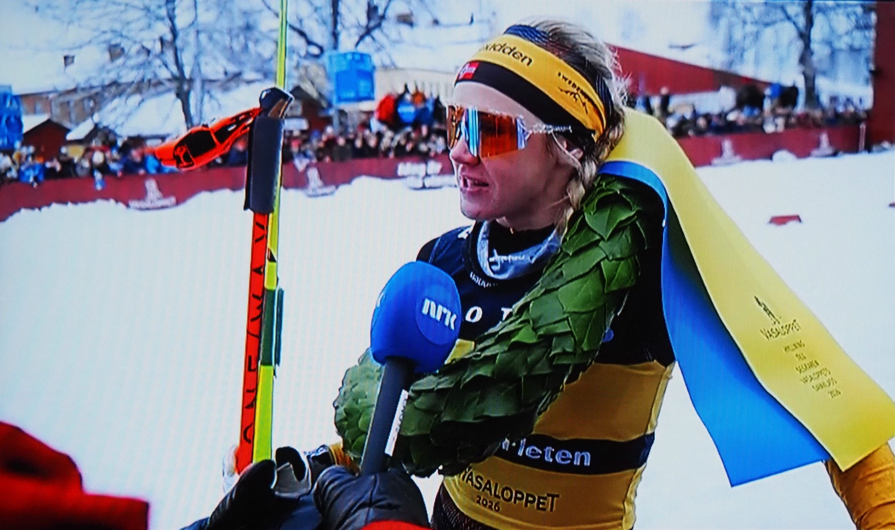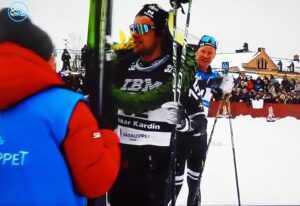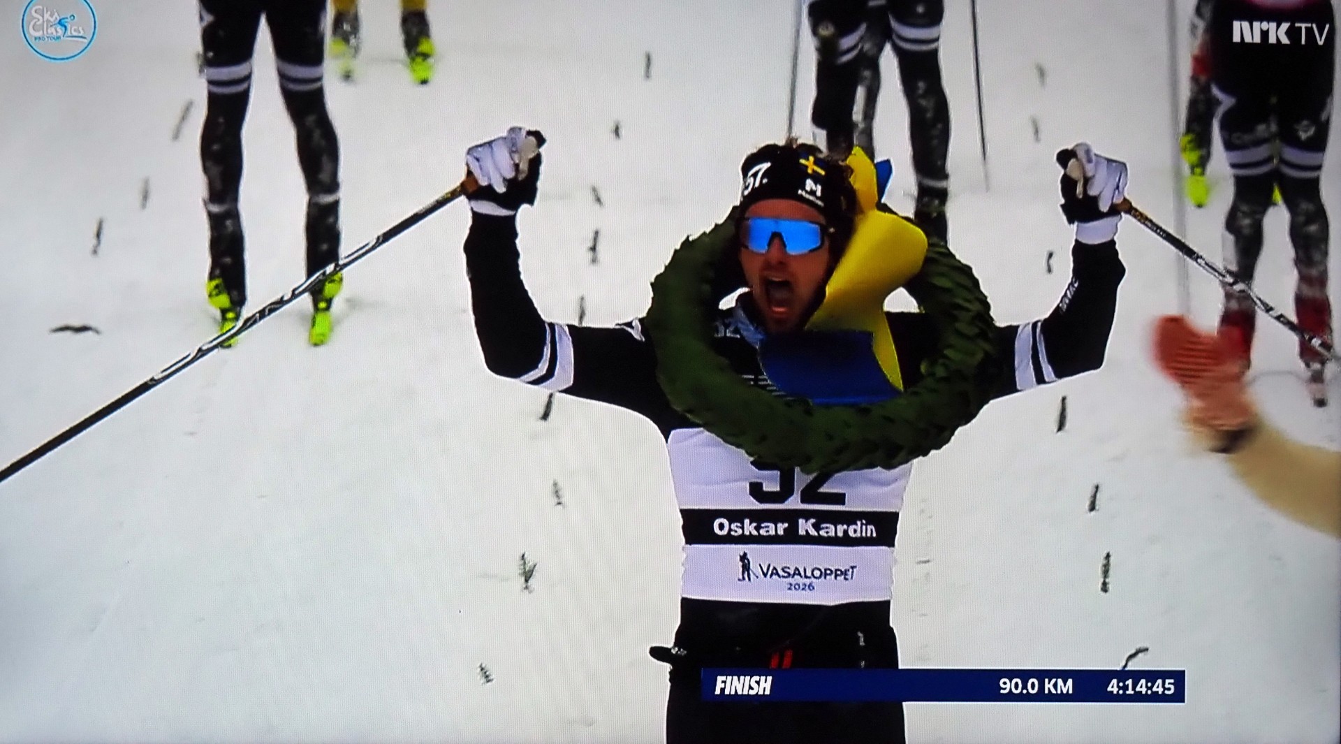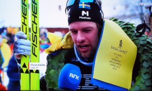 Han, Oscar Kardin, vinner Vasaloppet 2026, med en rød og en gull ski. Han er ikke utestengt, fordi han hadde et hjul i en ski og måtte byte den! Hij, Oscar Kardin, wint Vasaloppet 2026, maar moest 1 ski wisselen, omdat er een gat in die ski zat. Daarom werd hij niet geroyeerd