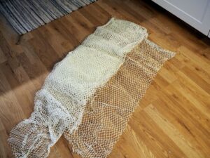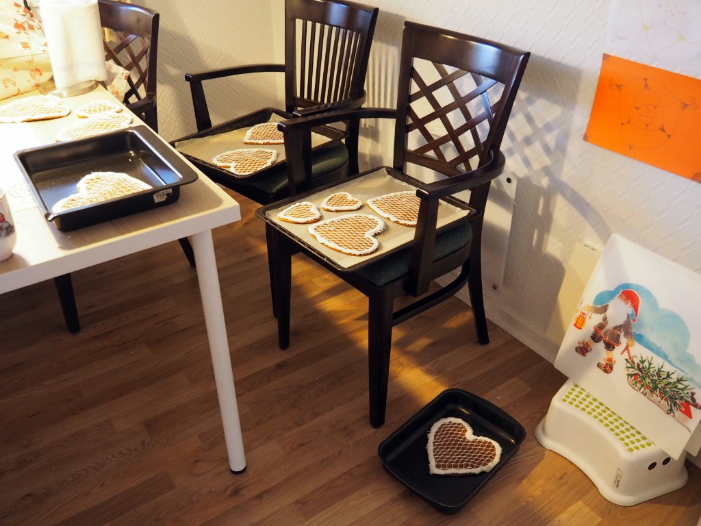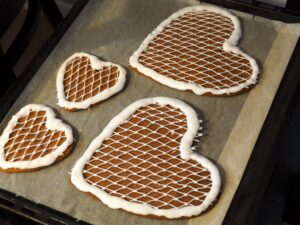 Ik heb weer ‘pepperkake’-harten gebakken en voorzien van visnetten uit Den Oever. Daardoor zijn de harten niet eetbaar, maar nadat de koek na een paar maanden naar beneden is geploft, hangt er nog een visnet-hart omringd door glazuur!
