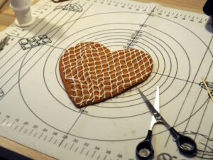 Et hjerte pepperkake-hjerte med nederlandske fiskegarn på toppen, så ikke spiselig! Men etter at pepperkake faller ned etter flere måneder, henger fiskegarnet med glasur fortsatt som hjerte.
