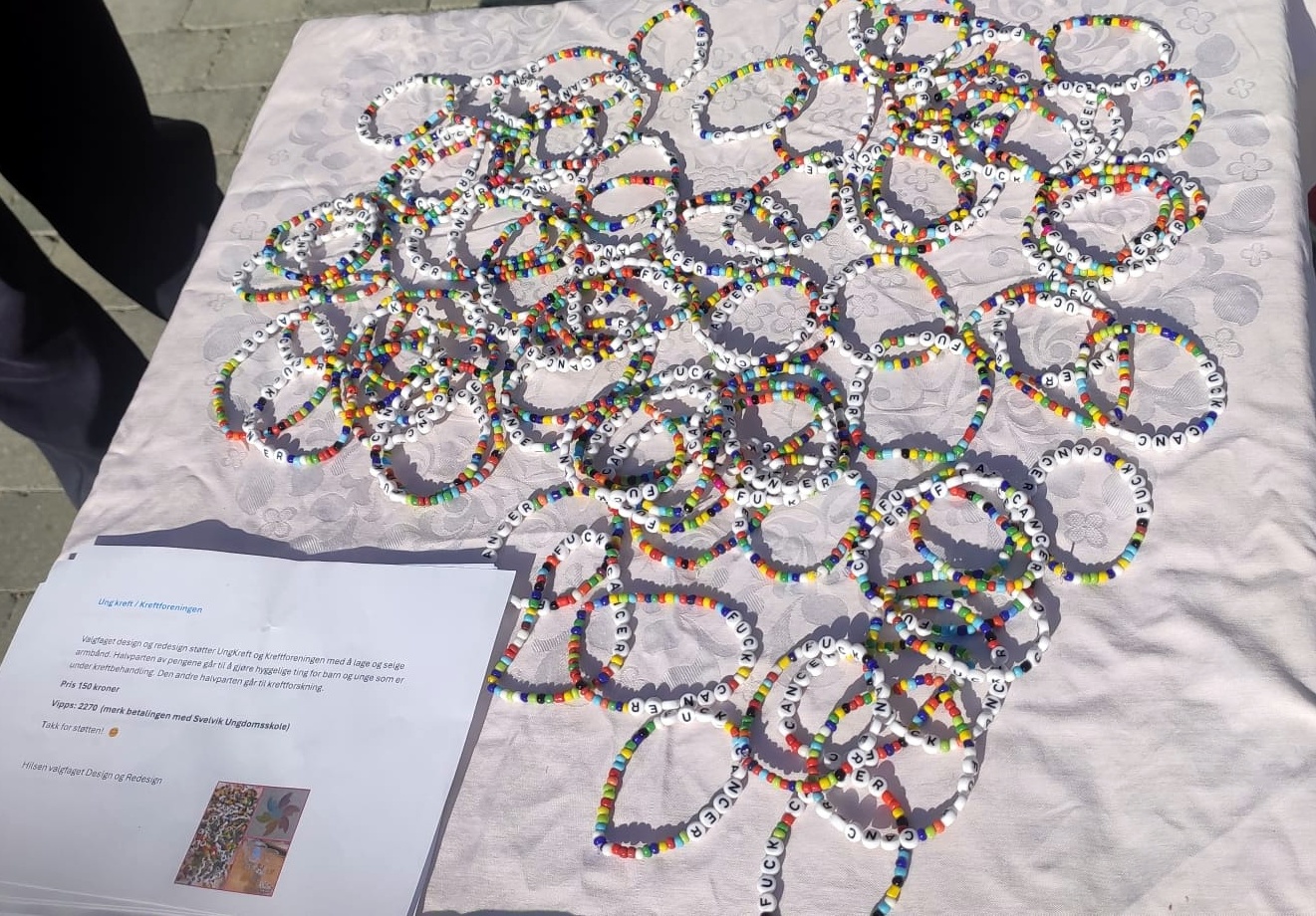 Mens Harco henger i lufta, kjøper jeg et armbånd med teksten ”Fuck Cancer” som er laget av elevene av Svelviks Videregående. Det finnes ikke noe slikt som tilfeldigheter, ikke sant? Terwijl Harco in de lucht hangt, koop ik een armband met de tekst ”Fuck Cancer” van leerlingen van Svelviks middelbare school. Toeval bestaat niet, toch?