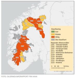 Seks av ti nasjonale villreinområde vart klassifiserte til dårleg kvalitet (raud). Dette var Knutshø, Snøhetta, Rondane, Nordfjella, Hardangervidda og Setesdal Ryfylke. Zes van de 10 omgevingen waar Wilde Rendieren voorkomen, staan op de rode lijst. LINK = https://www.nrk.no/vestfoldogtelemark/raudt-lys-for-seks-av-ti-villreinomrade