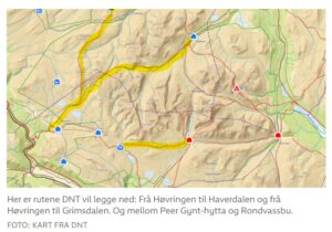Her er rutene DNT vil legge ned: Frå Høvringen til Haverdalen og frå Høvringen til Grimsdalen. Og mellom Peer Gynt-hytta og Rondvassbu. Se på lenken ovenfor. Deze routes sluit de DNT op de Rondane. Zie bovenstaande link