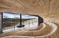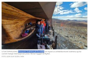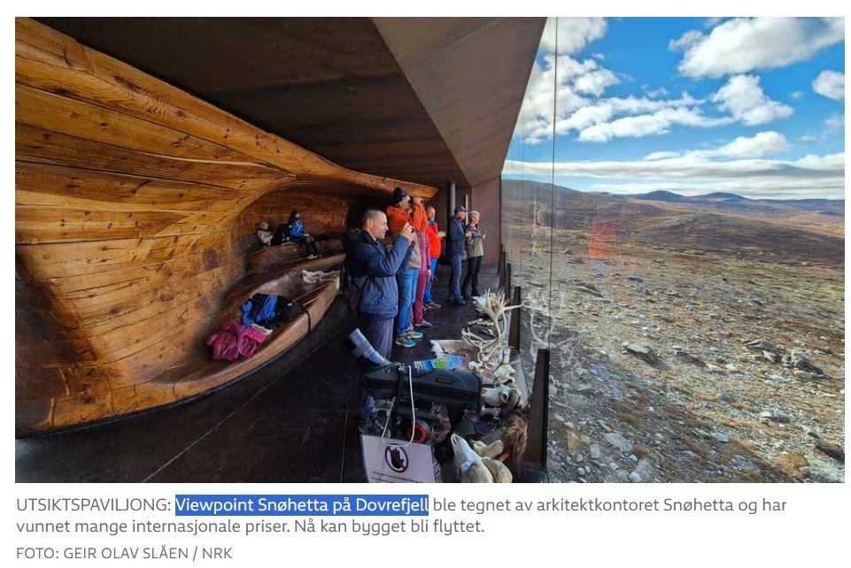 UTSIKTSPAVILJONG: Viewpoint Snøhetta på Dovrefjell ble tegnet av arkitektkontoret Snøhetta og har vunnet mange internasjonale priser. Nå kan bygget bli flyttet. Het indrukwekkende Viewpoint Snøhetta zal waarschijnlijk verhuizen. LINK = https://www.nrk.no/innlandet/klima–og-miljodepartementet-vurderer-flytting-av-viewpoint-snohetta-for-a-skane-villrein