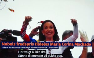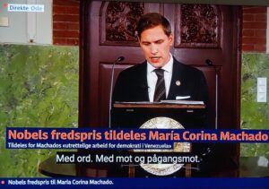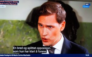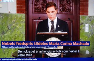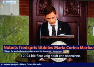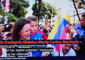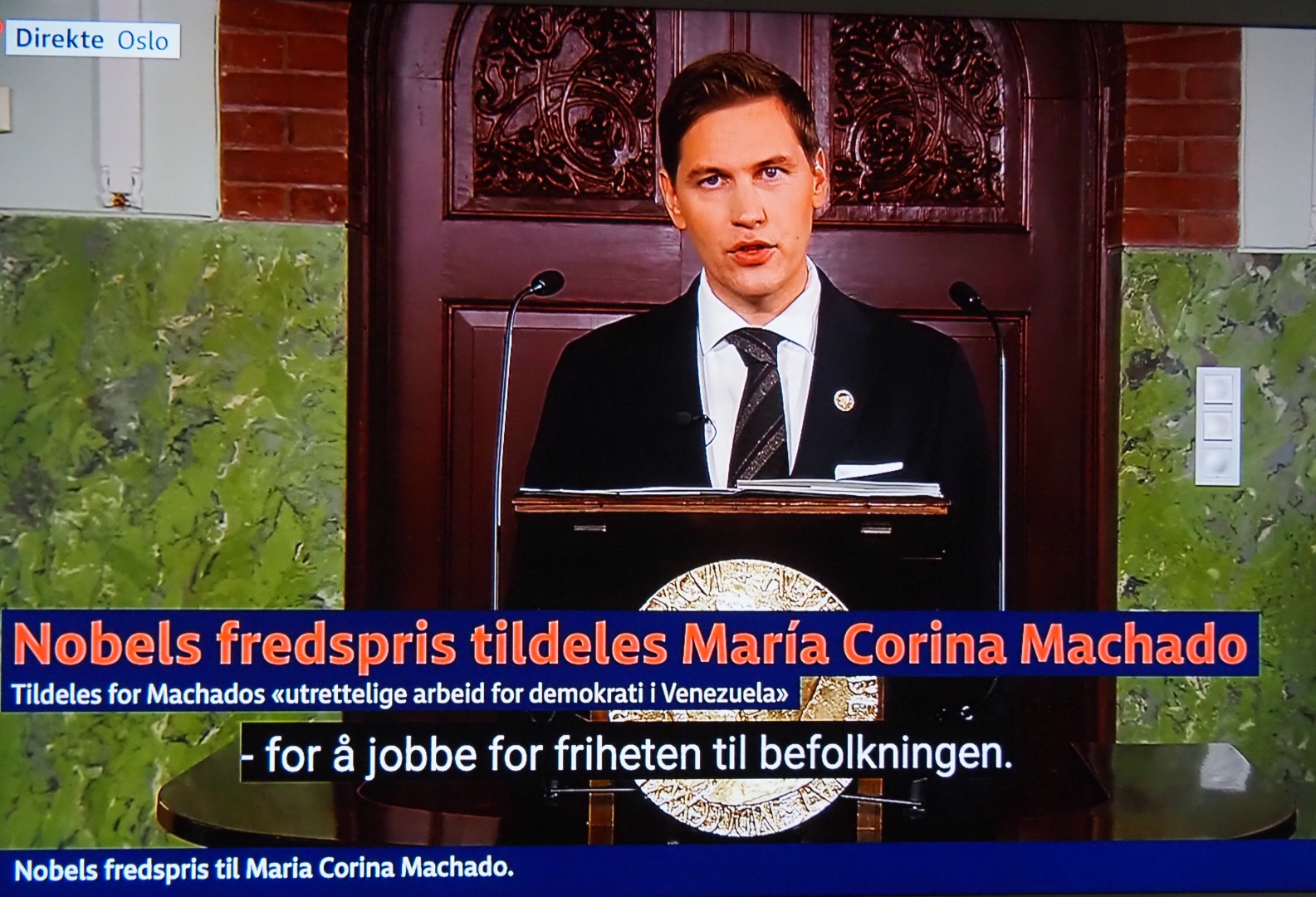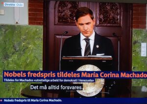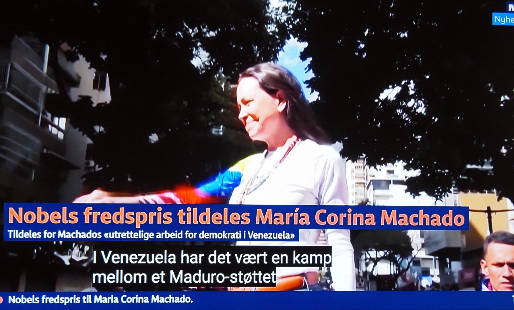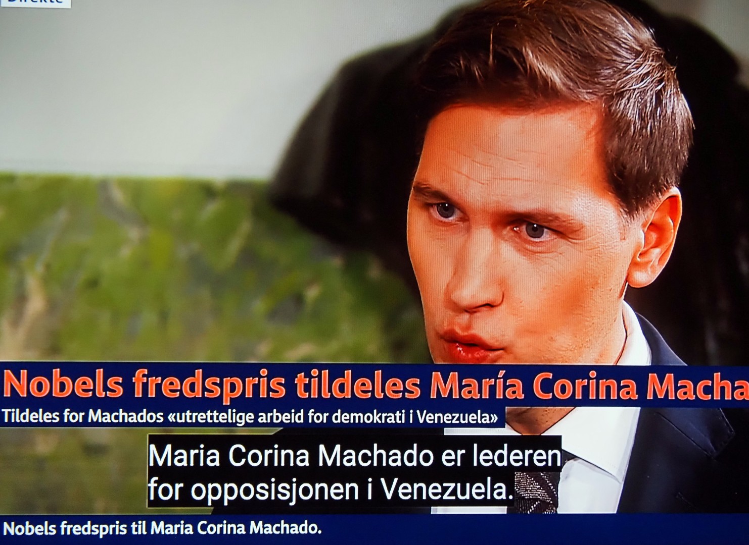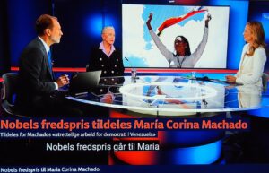 I studio snakker de om Maria Corina Machado. In de studio praten ze over de winnaar van de Nobels vredesprijs