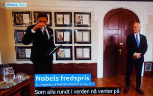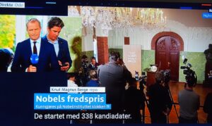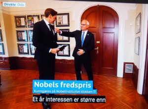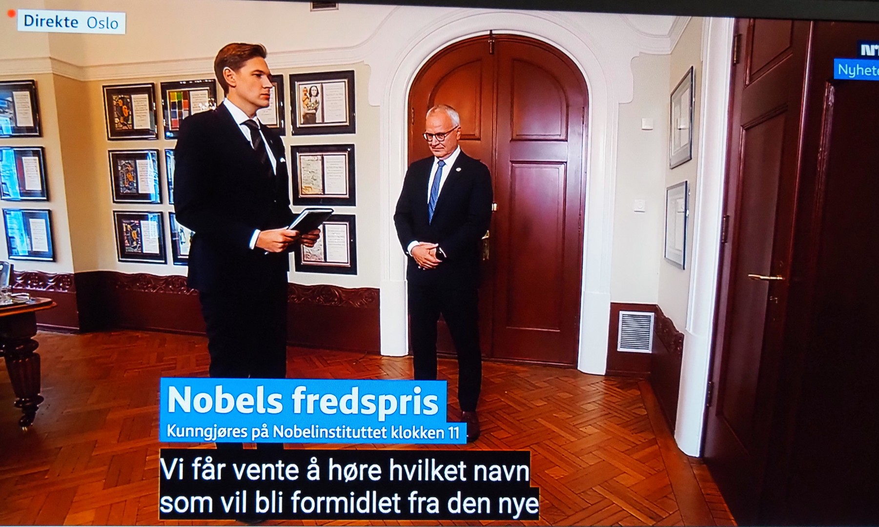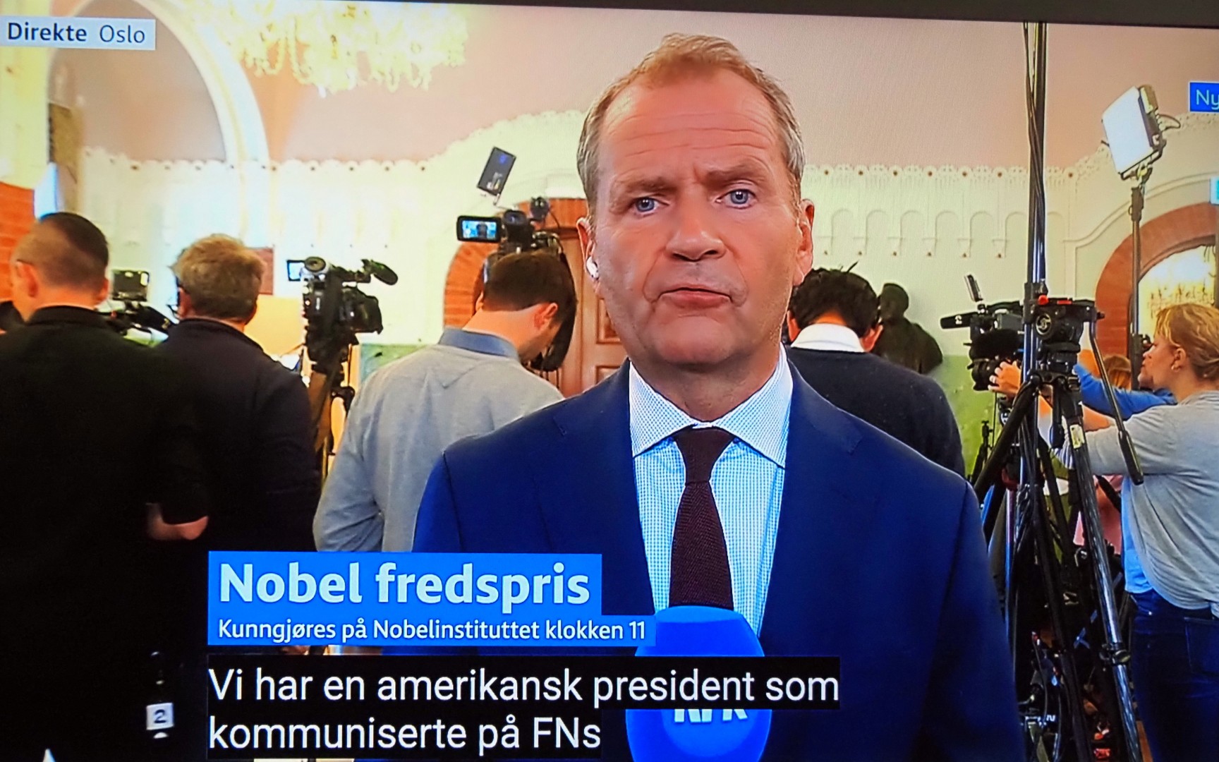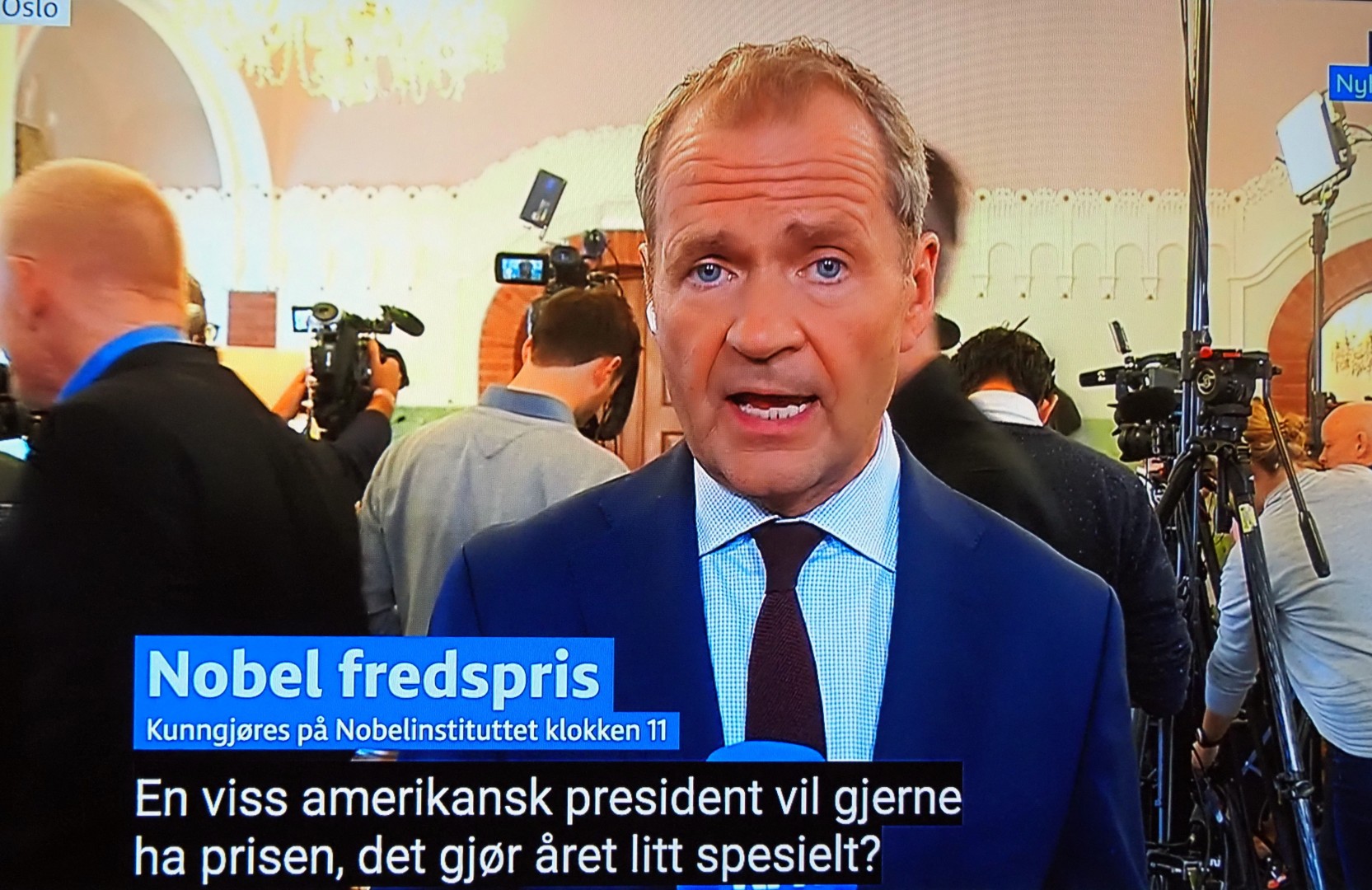 ”En viss amerikansk president vil gjerne ha prisen, det gjør året litt spesielt?” ”Een zekere Amerikaanse president wil graag de prijs krijgen, maakt dat dit jaar zo speciaal?” Noot Nardi: nog nooit wilden zoveel journalisten aanwezig zijn. Een deel moest afgezegd worden wegens ruimtegebrek