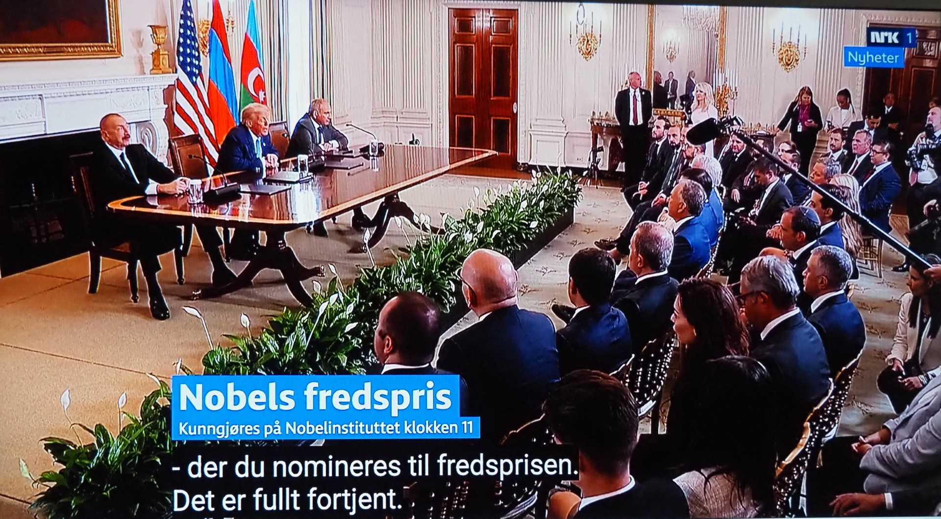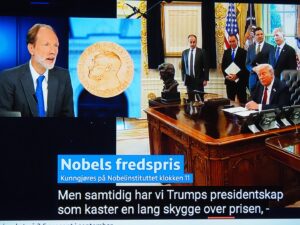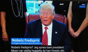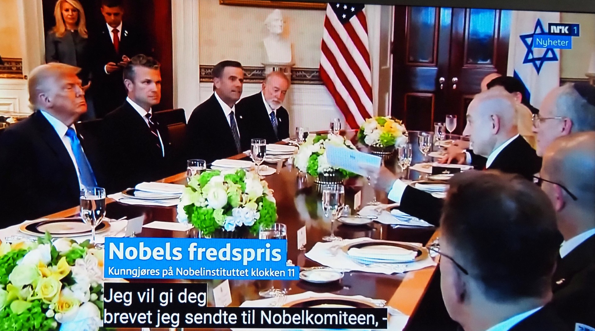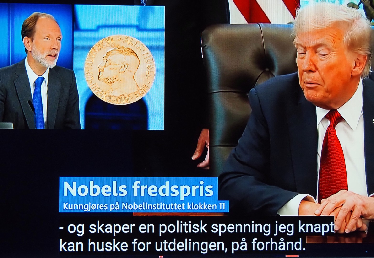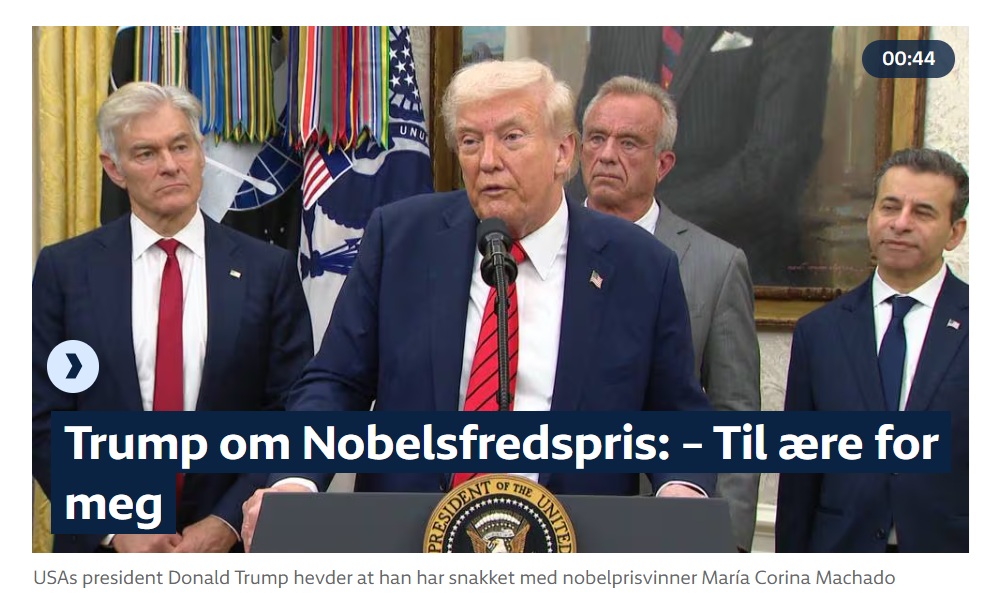 11.10.2025: Trump om Nobelsfredspris: ”Til ære for meg”. 11.10.2025: Trump over de Nobel vredesprijs: ”Die is ter ere van mij”. LINK = https://www.nrk.no/urix/trump-om-nobels-fredspris