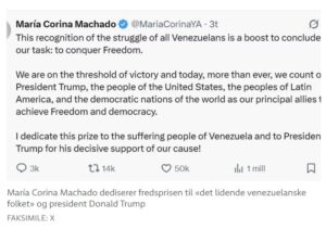 María Corina Machado dediserer fredsprisen til «det lidende venezuelanske folket» og president Donald Trump. Maria Corina Machado draagt de vredesprijs op aan het lijdende Venezuelaanse volk en president Trump.