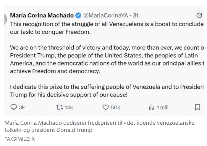 PS. Det reises nå spørsmål om Nobelkomiteens nominasjon, ettersom utenriksminister Rubio tilsynelatende nominerte henne, og Machado er en personlig venn av president Trump. Kunne Nobelkomiteen ha tildelt Machado prisen for å indirekte blidgjøre eller nominere Trump?