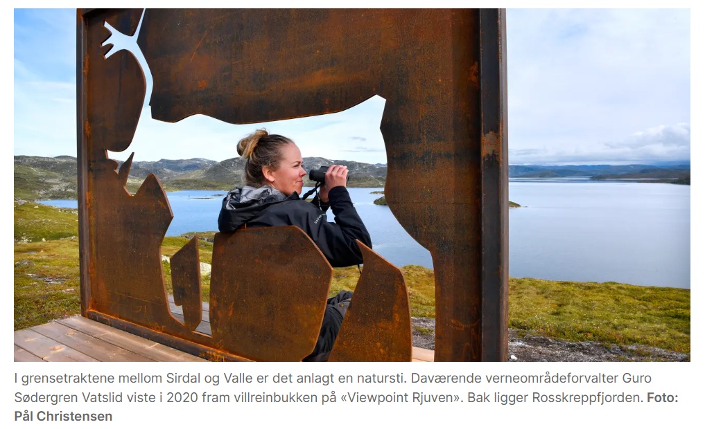 I grensetraktene mellom Sirdal og Valle er det anlagt en natursti. Daværende verneområdeforvalter Guro Sødergren Vatslid viste i 2020 fram villreinbukken på «Viewpoint Rjuven». Bak ligger Rosskreppfjorden. Foto: Pål Christensen. In het grensgebied tussen Sirdal en Valle is een natuurpad aangelegd. De toenmalige beheerder van het beschermde gebied, Guro Sødergren Vatslid, toonde in 2020 de wilde rendierbok bij “Uitkijkpunt Rjuven”. Daarachter ligt het Rosskreppfjord. Foto: Pål Christensen. LINK = https://www.aftenbladet.no/lokalt/i/AvayaA/dette-kan-ramme-tusenvis-av-hytteeiere-i-sirdal-og-ryfylke