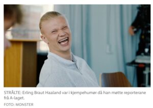 Erling Braut Halland strålte mens A-laget ”grillet” han. Erling Braut Halland straalde, terwijl het A-team hem onder vuur nam. Foto: Monster. LINK = https://www.nrk.no/sport/haaland-_grilla_-av-a-laget-i-tre-timar-avslorer-hemmelegheit-om-haret