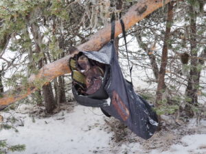 Den 18. februar 2019 på ski til Hamnsætra ser vi midt i perioden det er forbudt å parkere på Venabygdsfjellet pga. sårbar Villrein, utstyr som venter på jegeren. Op 18 februari te ski op weg naar Hamnsætra, hangt deze jachtuitrusting in een boom te wachten op een jager. In de periode dat het verboden is om te parkeren langs weg 27 over Venabygdsfjellet vanwege ”kwetsbare Wilde Rendieren”!