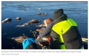 Så langt er det funnet 190 reinsdyr i innsjøen Stuorajávri. Dette er en dyretragedie som preger mange. Foto: Nils Ante Gaup. 22.10.2024. Er werden 190 dode Tamrendieren gevonden op 22 oktober 2024. LINK = https://www.nrk.no/sapmi/tror-de-kunnet-reddet-flere-av-de-190-reinsdyrene-som-gikk-gjennom-isen-med-rett-utstyr
