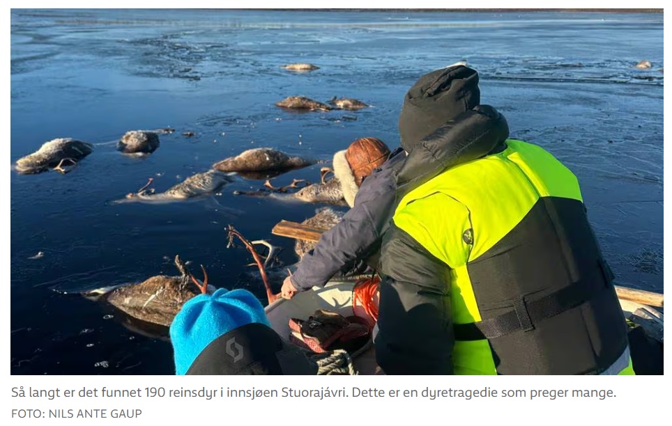 Så langt er det funnet 190 reinsdyr i innsjøen Stuorajávri. Dette er en dyretragedie som preger mange. Foto: Nils Ante Gaup. 22.10.2024. Er werden 190 dode Tamrendieren gevonden op 22 oktober 2024. LINK = https://www.nrk.no/sapmi/tror-de-kunnet-reddet-flere-av-de-190-reinsdyrene-som-gikk-gjennom-isen-med-rett-utstyr