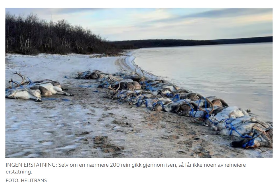 I fjor mistet flere reineiere 259 dyr i en drukningsulykke i Kautokeino. Kun deler av dette blir erstattet. Vorig jaar verdronken 259 Tamrendieren in Kautokeine. Naast de dierentragedie een grote financiële strop voor tamrendieren-eigenaren. LINK = https://www.nrk.no/sapmi/flere-reineiere-star-uten-erstatning-etter-dyretragedie-i-kautokeino