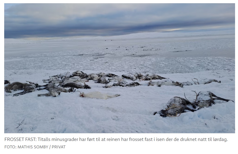 Foto: Mathis Somby / Privat. Bij tientallen vorstgraden vroren Tamme Rendieren vast in het ijs op 24 oktober 2023. LINK = https://www.nrk.no/sapmi/flere-hundre-rein-druknet-i-porsanger