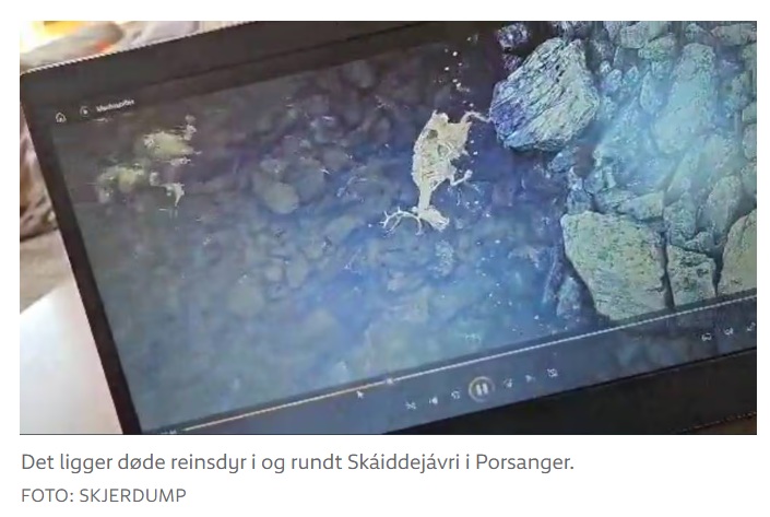 Det ligger døde reinsdyr i og rundt Skáiddejávri i Porsanger. Reinkavadrene ligger fortsatt i og rundt vannet. Foto: Skjerdump, 02.07.2024. Er liggen in het fjord bij Porsanger dode Tamrendieren. De kadavers zijn nog niet opgeruimd. 2 juli 2024. LINK = https://www.nrk.no/sapmi/over-hundre-rein-druknet-_-til-trekker-seg-orn-og-utgjor-en-mulig-for-urensning