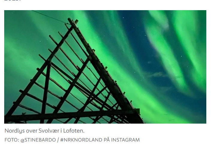 Nordlys over Svolvær i Lofoten. Foto: @stinebardo / #NRKNORDLAND PÅ INSTAGRAM. Noorderlicht op Svolvær, Lofoten. LINK = https://www.nrk.no/nordland/nordlys_-forskere-spar-kraftigere-nordlys-de-neste-arene