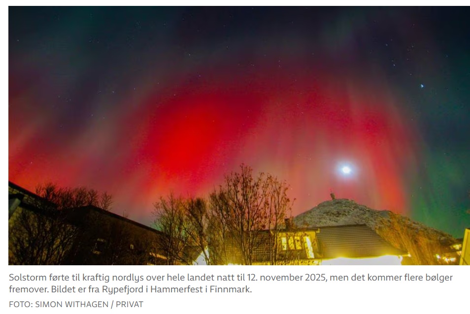 Solstorm førte til kraftig nordlys over hele landet natt til 12. november 2025, men det kommer flere bølger fremover. Bildet er fra Rypefjord i Hammerfest i Finnmark. Foto: Simon Withagen / Privat. De zonnestorm zorgde voor een krachtig noorderlicht de nacht van 11 op 12 november. LINK = https://www.nrk.no/tromsogfinnmark/kraftig-solstorm-kan-gi-spektakulaert-nordlys-over-hele-norge
