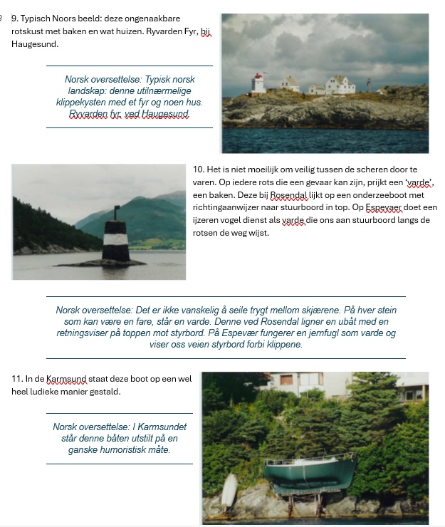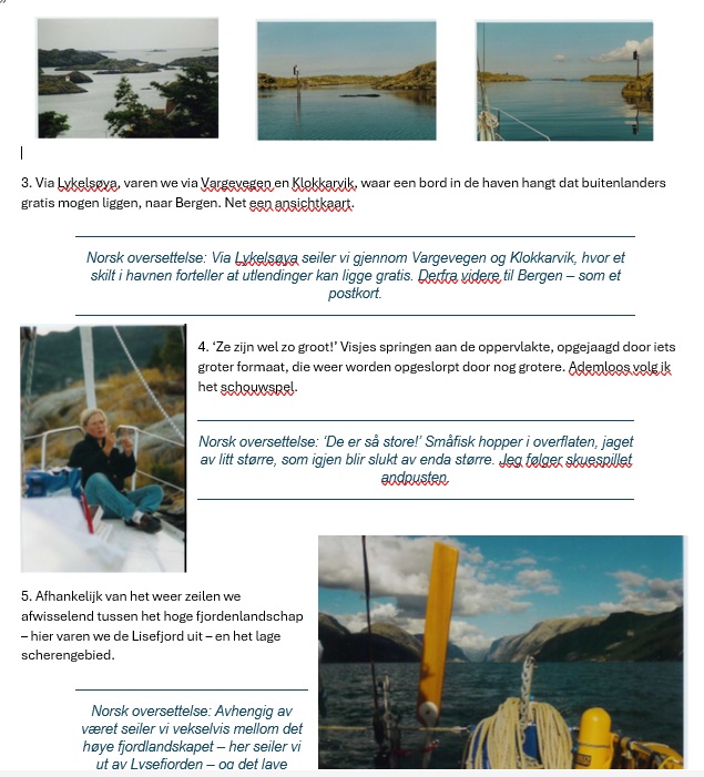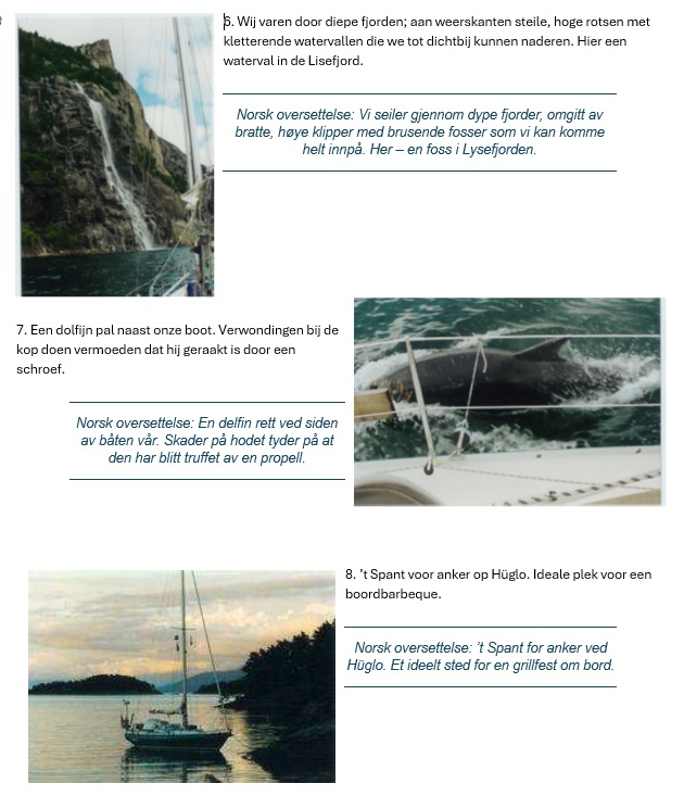 Txt 1: Vi seiler gjennom dype fjorder, omgitt av bratte, høye klipper med brusende fosser som vi kan komme helt innpå. Her – en foss i Lysefjorden. Txt 2: En delfin rett ved siden av båten vår. Skader på hodet tyder på at den har blitt truffet av en propell. Txt 3: : ’t Spant for anker ved Hüglo. Et ideelt sted for en grillfest om bord. Klik op de foto = leesbare txt!