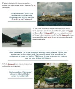 Txt 1: Typisk norsk landskap: denne utilnærmelige klippekysten med et fyr og noen hus. Ryvarden fyr, ved Haugesund. Txt 2: : Det er ikke vanskelig å seile trygt mellom skjærene. På hver stein som kan være en fare, står en varde. Denne ved Rosendal ligner en ubåt med en retningsviser på toppen mot styrbord. På Espevær fungerer en jernfugl som varde og viser oss veien styrbord forbi klippene. Txt 3: : I Karmsundet står denne båten utstilt på en ganske humoristisk måte.