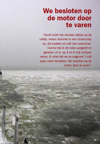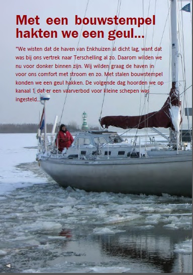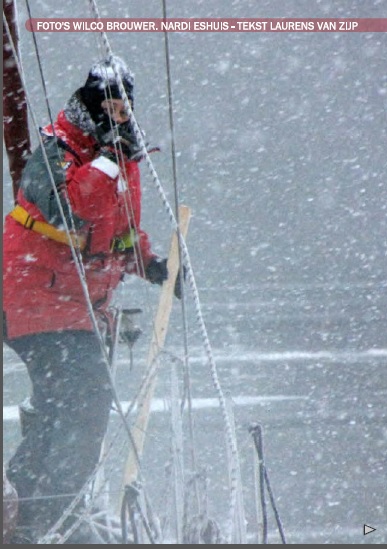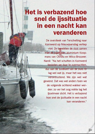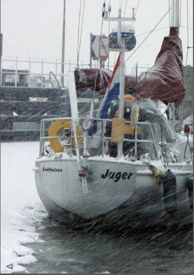 Her er den slitsomme seilturen gjennom snø og is med Jagers etter en jul på Terschelling. Akkurat i tide til å fortøye i Compagnieshaven, etter siste isbrytingen!