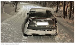 En bil med mexicanske turister endte opp flere hundre meter inn i ei lysløype ved Prestvannet i Tromsø. Foto: Troms politidistrikt. Mexicaanse toeristen reden zich vast in een geprepareerde skiløype. Google Maps stuurt je tenslotte de korste weg 😉 Blijkbaar gebeurt dit hier vaker. LINK = https://www.nrk.no/nyheter/turister-kjorte-seg-fast-i-skiloype-i-tromso