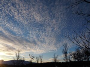 ChatGPT: ”Skyene antyder at været kan endre seg, ofte mot mer skyer og muligens nedbør, selv om det akkurat nå er klart og rolig.” Det stemmer! Vi skal ha snø i morgen! ChatGPT zegt dat deze wolken wijzen op een weeromslag. Nou, dat klopt. Morgen valt er sneeuw.