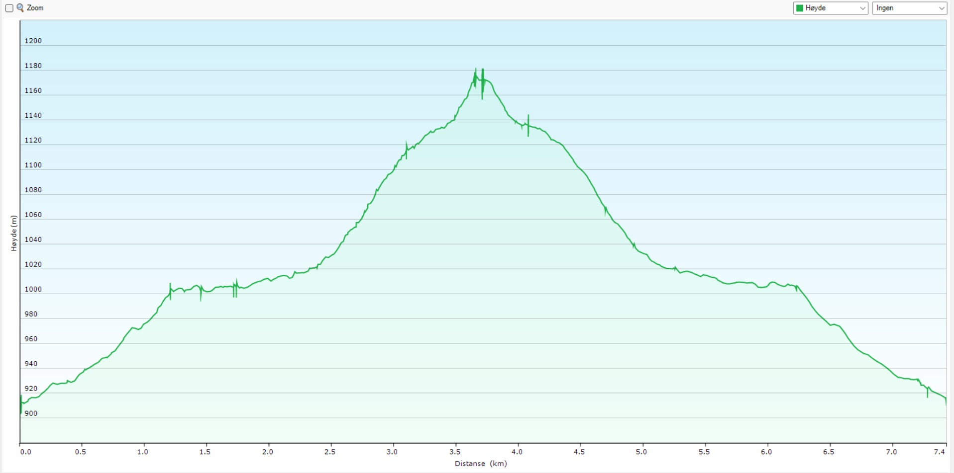 Diagram: 7,6km og stigning 417m. Daigram 7,4km en stijging 417m
