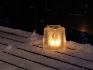 1) We hebben drie ijskaarsen op Lunden met een plastic houder en waxinelichtjes in zo’n plastic houder. ‘s Nachts verdwijnen de waxinelichtjes en de plastic houders uit de ijskaarsen! Elke nacht.