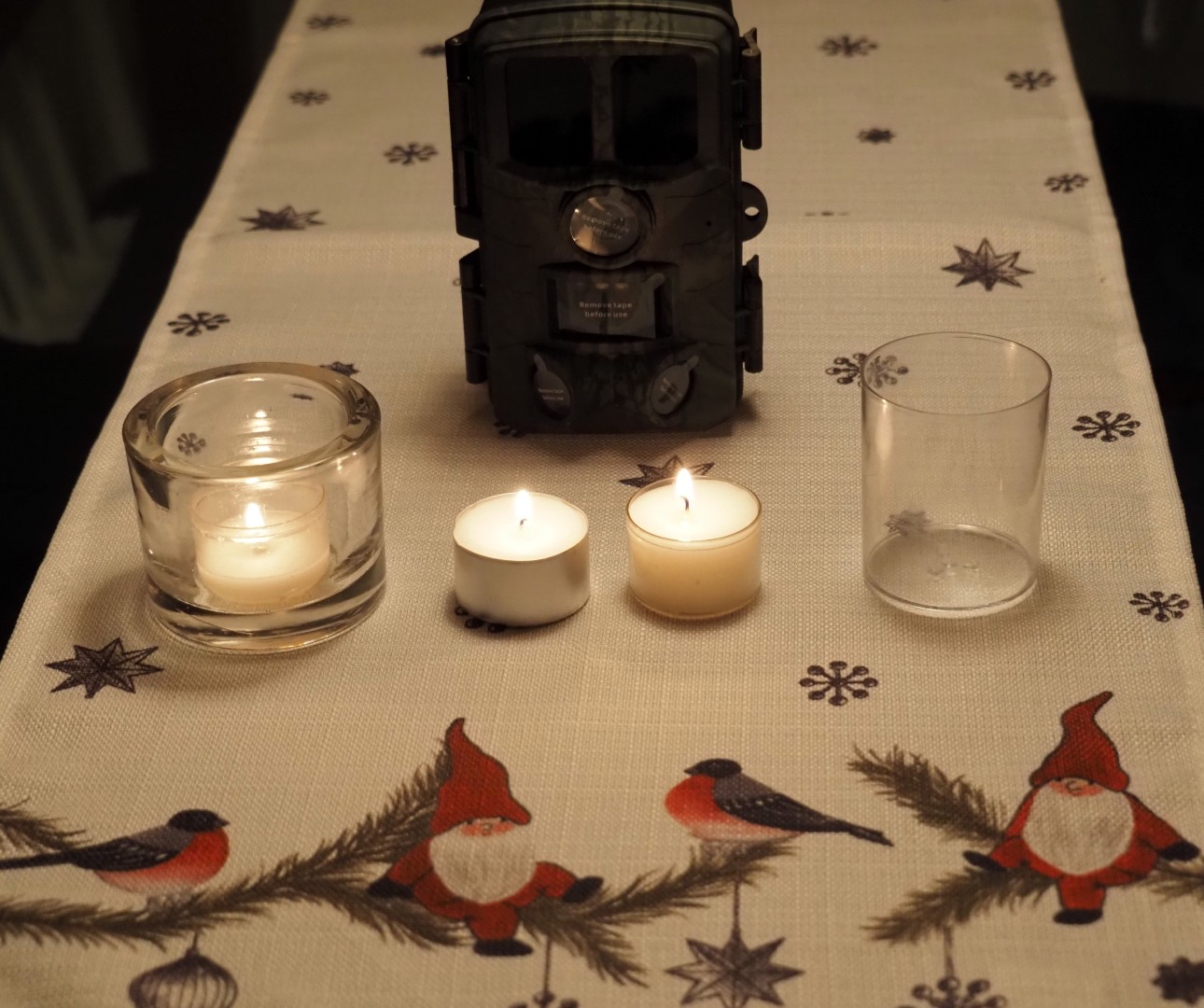 Fra høyre til venstre: plastholderen for telys telys i plastholderen, telys i aluminium holderen og en tung glass holder. I bakgrunnen viltkameraet. Van rechts naar links: de plastic houder voor waxinelichtjes, waxinelicht in plastic houder, waxinelicht in aluminium houder en een zware glazen houder. Op de achtergrond de wildcamera