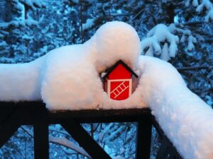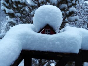 Før vi kan gå på ski, må vi først henge opp en ekornmater, måke snø osv. Voordat we te ski gaan, moeten we eerst een eekhoornvoeder ophangen en wat sneeuw ruimen!