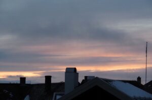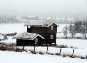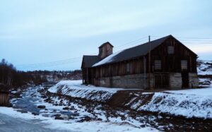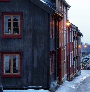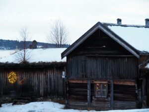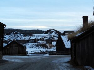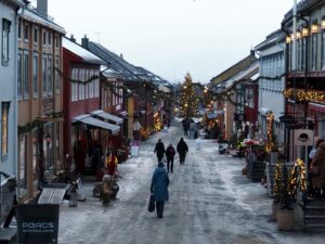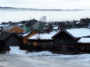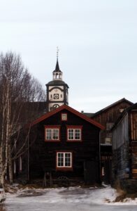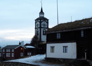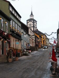 Het is mistig en rond het vriespunt. De sneeuw verandert is ijs. In Røros zie je de kerk over al waar je gaat.