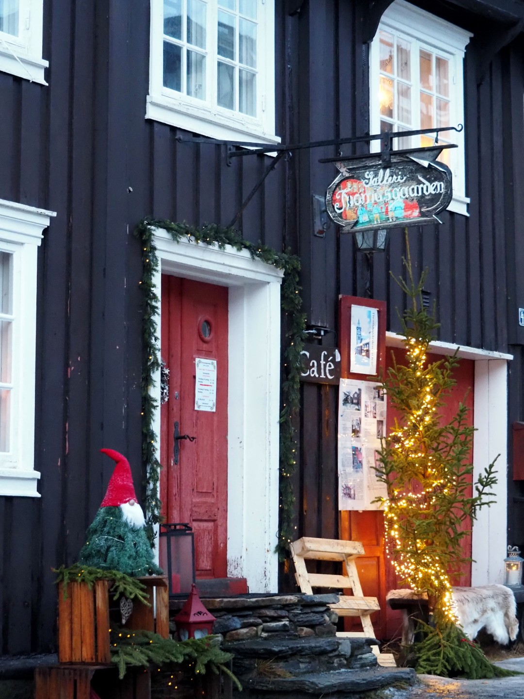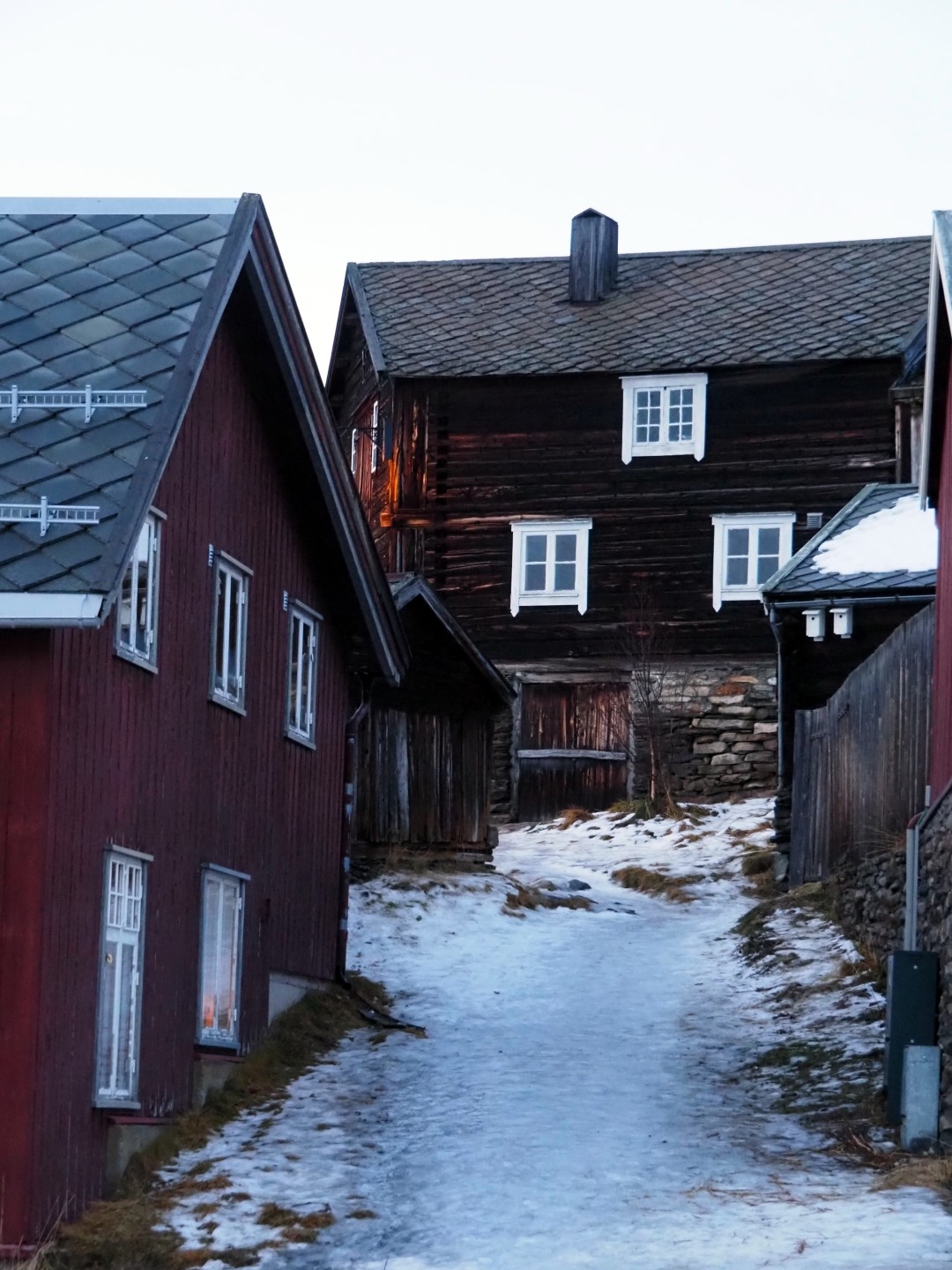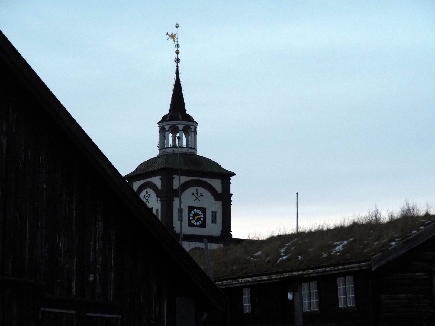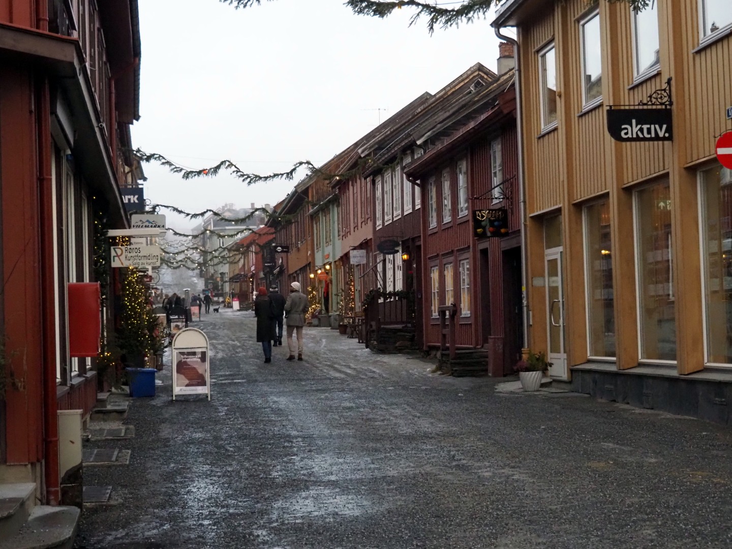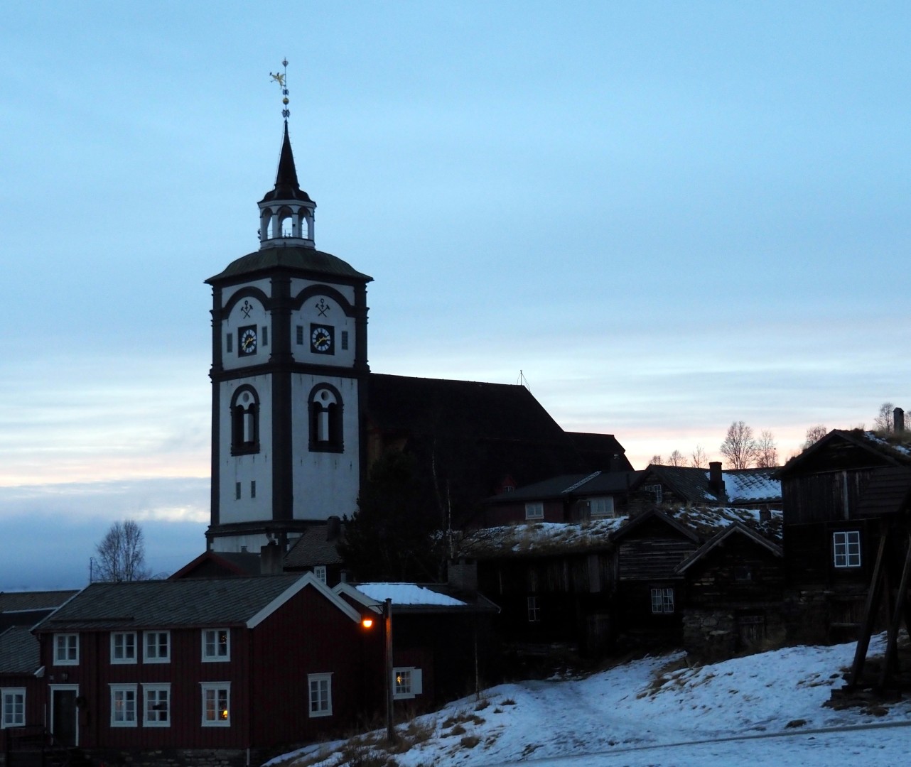 Het is mistig en rond het vriespunt. De sneeuw verandert is ijs. In Røros zie je de kerk over al waar je gaat.