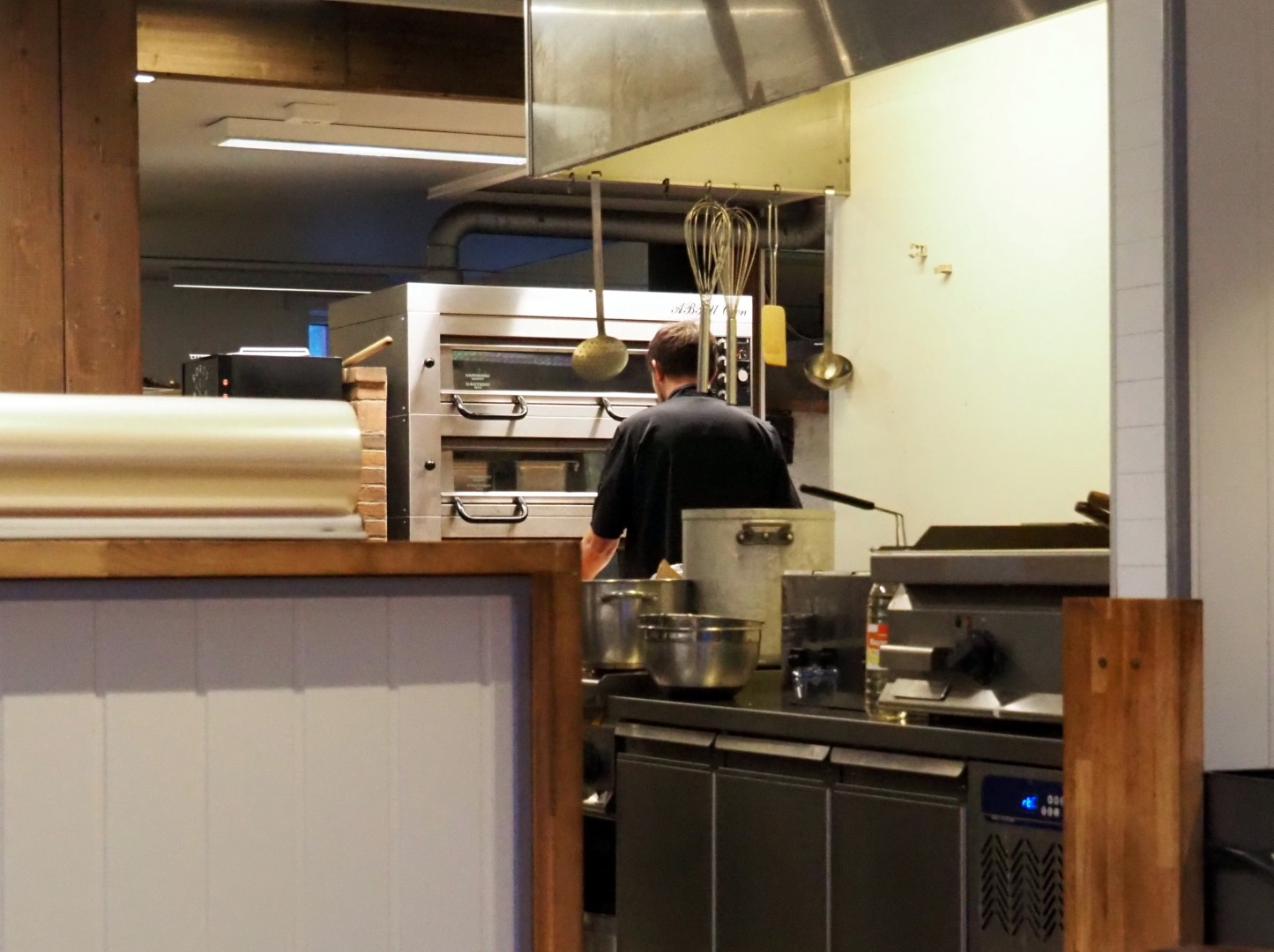 Vi drikke kaffe i et bakeri hvor vi kan føller med i bakeriet. We drinken koffie bij een bakker, die we kunnen volgen in zijn bakkerij