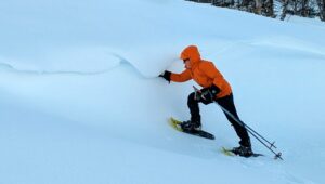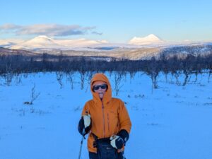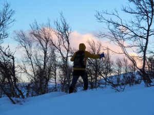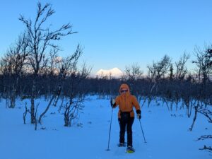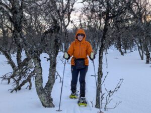 Na twee operaties in 2025 is het spannend, die eerste sneeuwschoenenwandeling. Maar het ging prima, daar beneden Snødølhøgda.