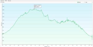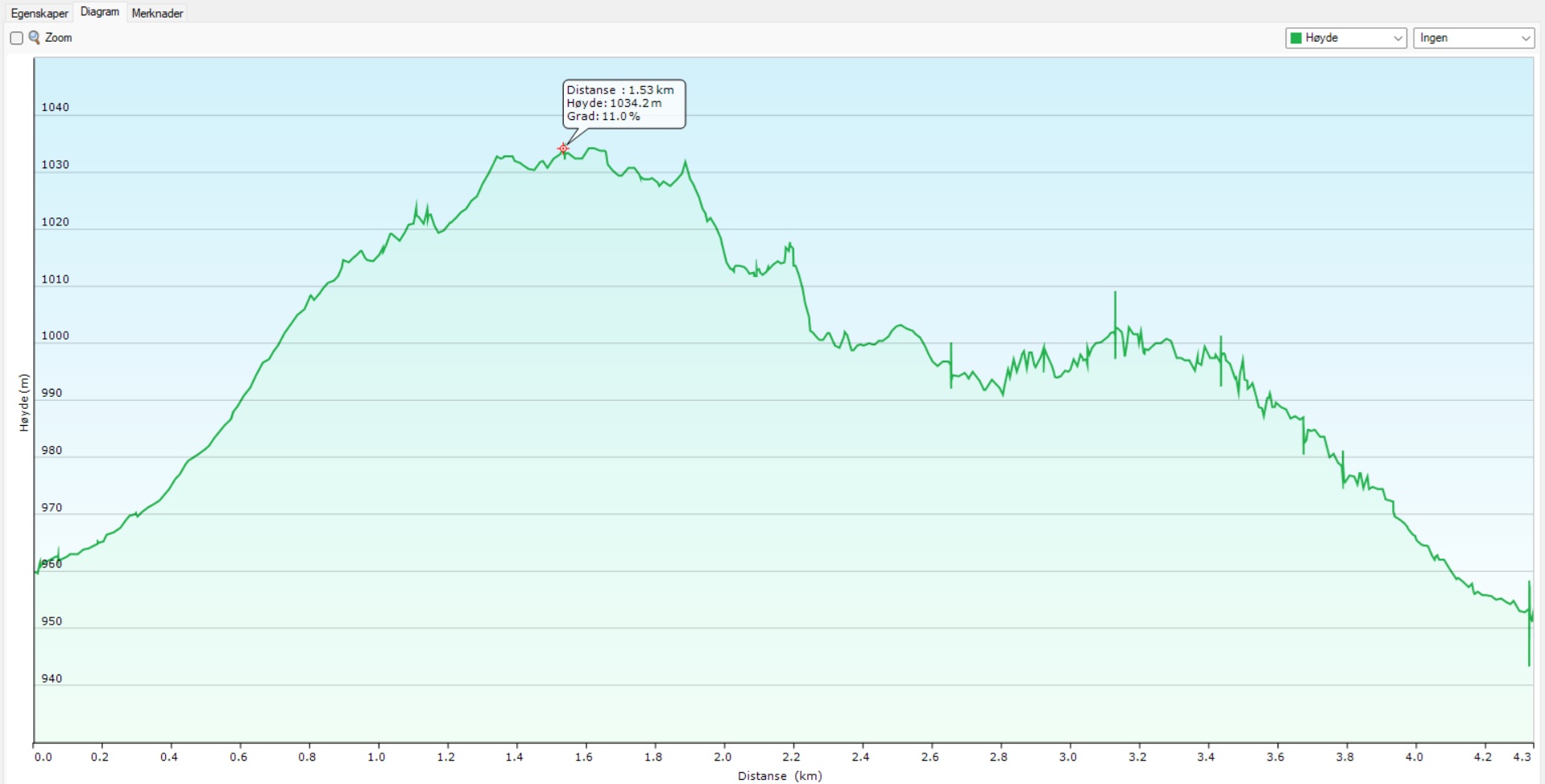 Diagram: høyde x lengde. 4,5 km, stigining 219 m. Diagram: hoogte x afstand. 4,5 km, stijging 219 m