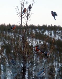 Ingen skitur på mandag den 29. desember i det isete område. Vi har nysnø, men ikke nok! Da var det ekstra fint å se 9 + 9 Dompapper samtidig!