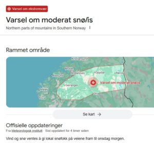 Lokalt vanskelig kjøreforhold: Bruk riktige dekk og kjør etter forholdene. Beregn ekstra tid til transport og kjøring. Følg råd og sjekk status fra transportaktører. Sjekk veimeldinger på vegvesen.no/trafikk. Kle deg etter forholdene: Unngå unødvendig ferdsel på utsatte steder, og kle deg etter forholdene. Vi bor i midten! Plaatselijk moeilijke rijomstandigheden: Gebruik de juiste banden en pas uw rijgedrag aan de omstandigheden aan. Plan extra reistijd in voor transport en de rit zelf. Volg de adviezen van vervoersbedrijven op en controleer de actuele situatie. Raadpleeg verkeersinformatie op vegvesen.no/trafikk. Kleed u naar de omstandigheden: Vermijd onnodige reizen in open gebieden en kleed u naar de weersomstandigheden. Wij wonen er precies middenin!