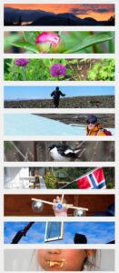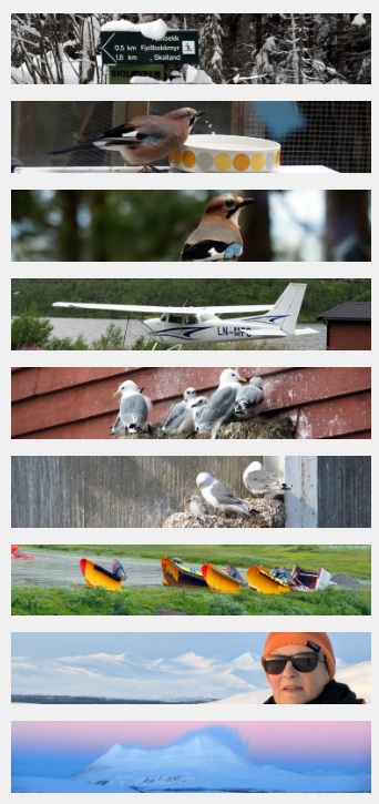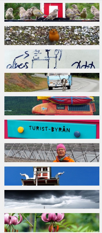 Hver gang du åpner en blogg, ser du ad random et nytt toppbilde («header») øverst. Når du klikker på toppbildet mens bloggen er åpen, vises også et nytt bilde. Jeg har laget omtrent 150 toppbilder! Klikk i gang! 😉
