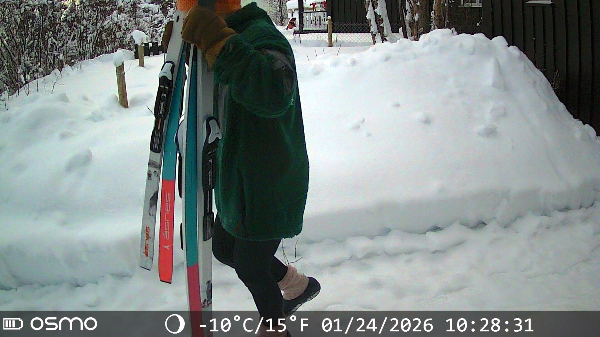 24.01.2026: Jeg henter skies ut av boden. -10ºC. 24.01.2026: Ik haal skies uit de schuur. -10ºC