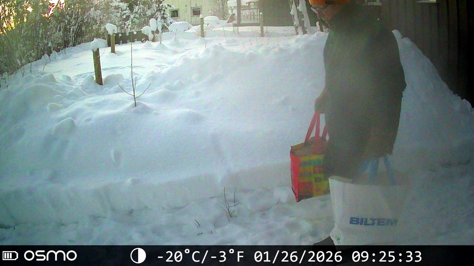 26.01.2026. To sekker med ved på en gang. -20ºC. Twee zakken hout in een keer. -20ºC.
