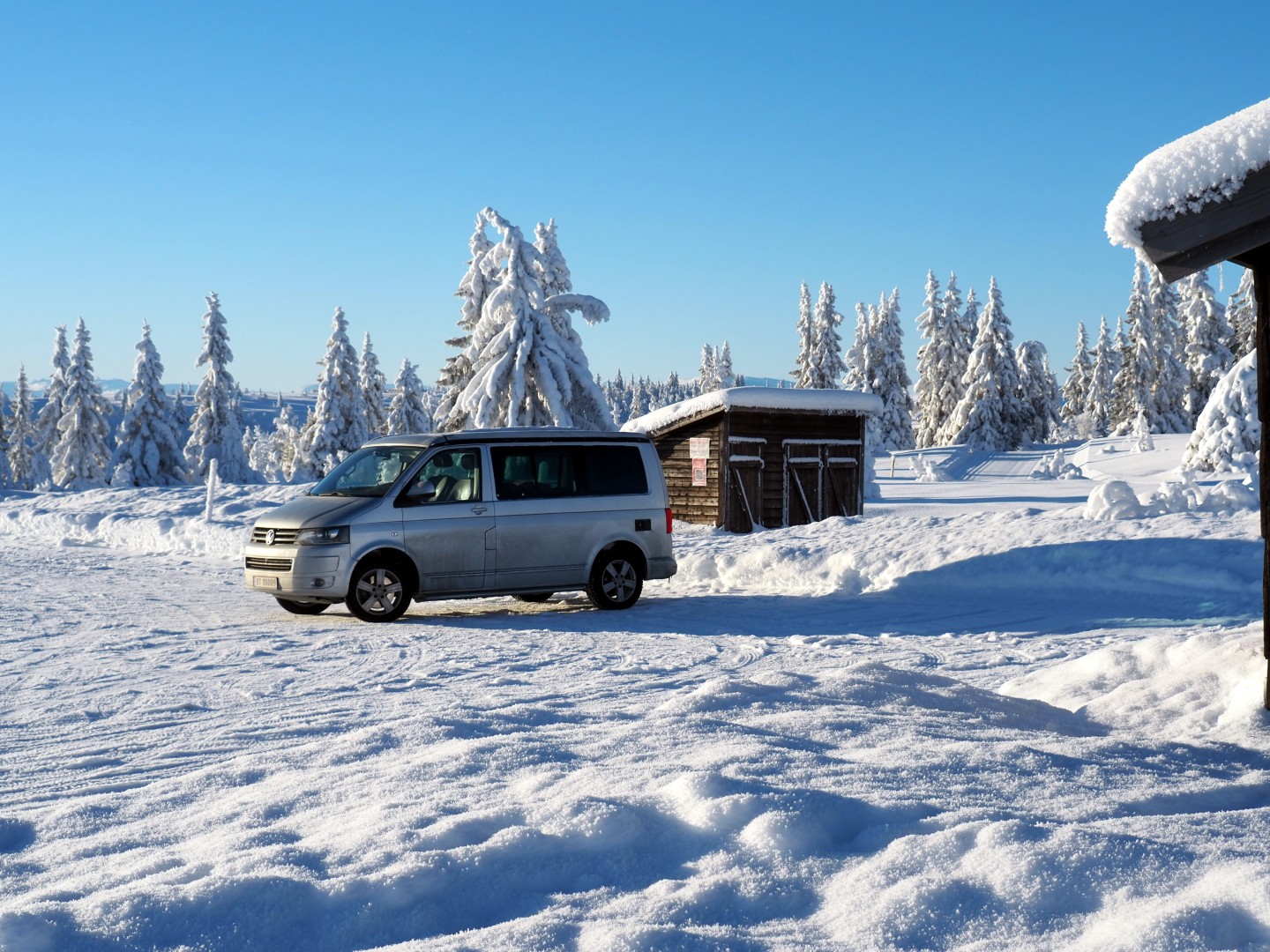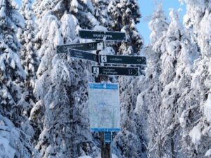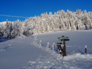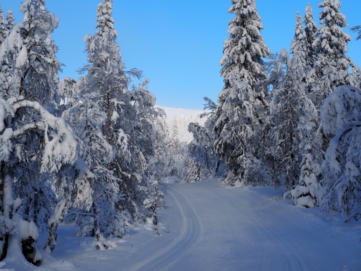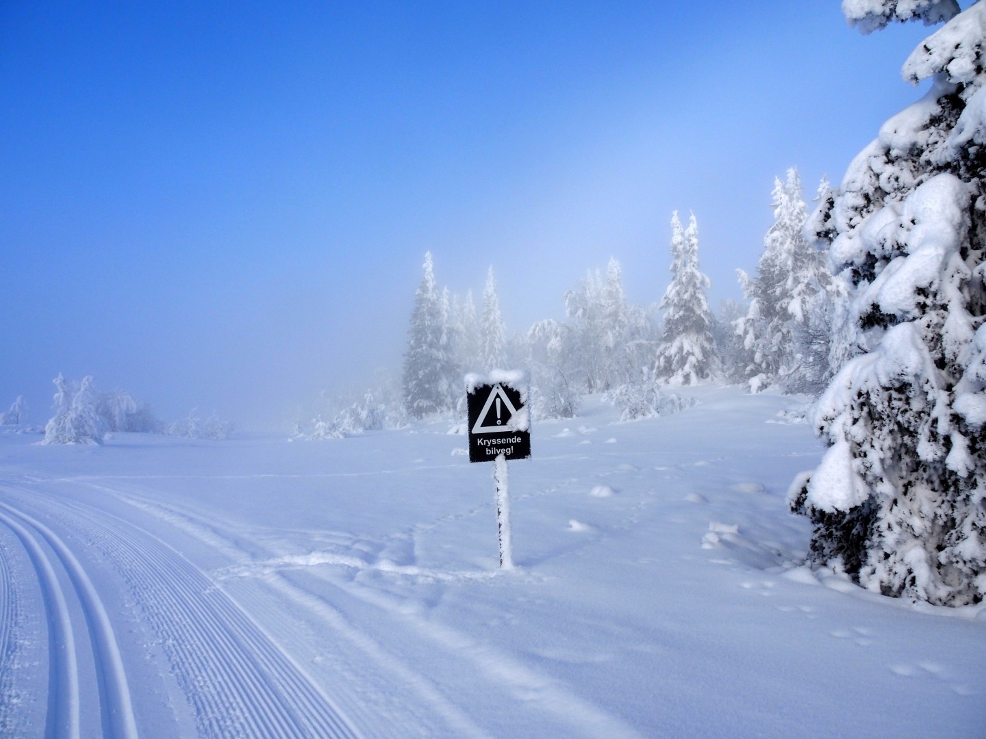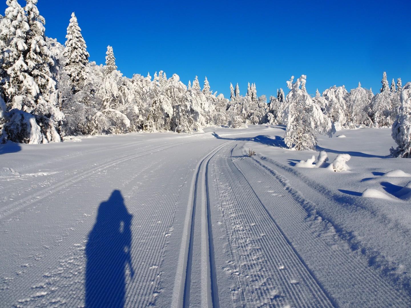 Midt i skogen brøyter de til hytter! Så jeg skal krysse en skogsvei. Zelfs midden in het bos worden boswegen sneeuwvrij gehouden voor huteigenaren. Ik moet dus oppassen als ik de weg oversteek. Hahaha, geen ziel te bekennen natuuuuuuurlijk!