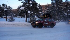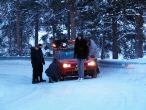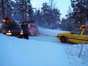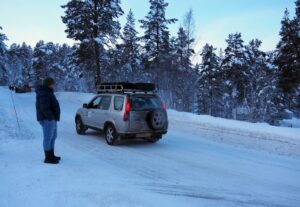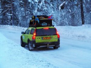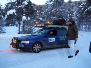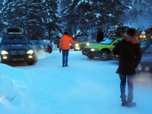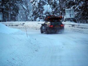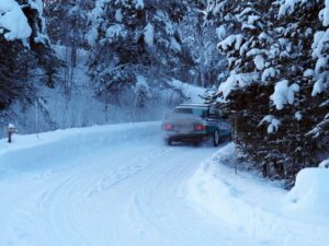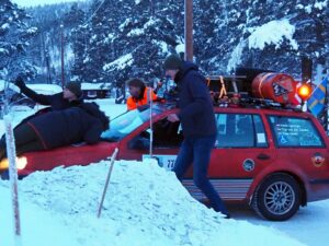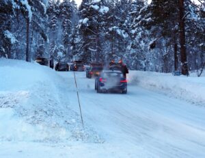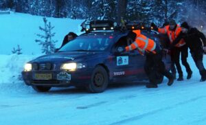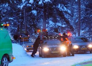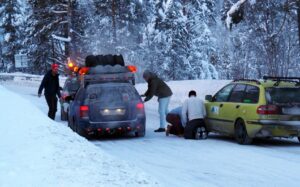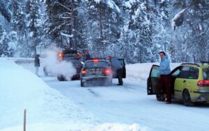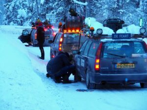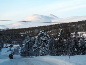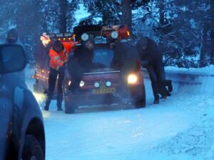 Voor Noren is dit een onbegrijpelijk spectakel. Het komt zelden voor, dat een auto met een Noors nummerbord niet omhoog komt richting Venabygdsfjellet. Na ons huis is de helling 12%, maar met de juiste winterbanden of spijkerbanden en bij voorkeur 4-wiel-aandrijving, is het geen probleem. Wij rijden dit dagelijks en zien nu de ene auto na de andere ‘sneuvelen’.