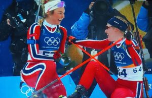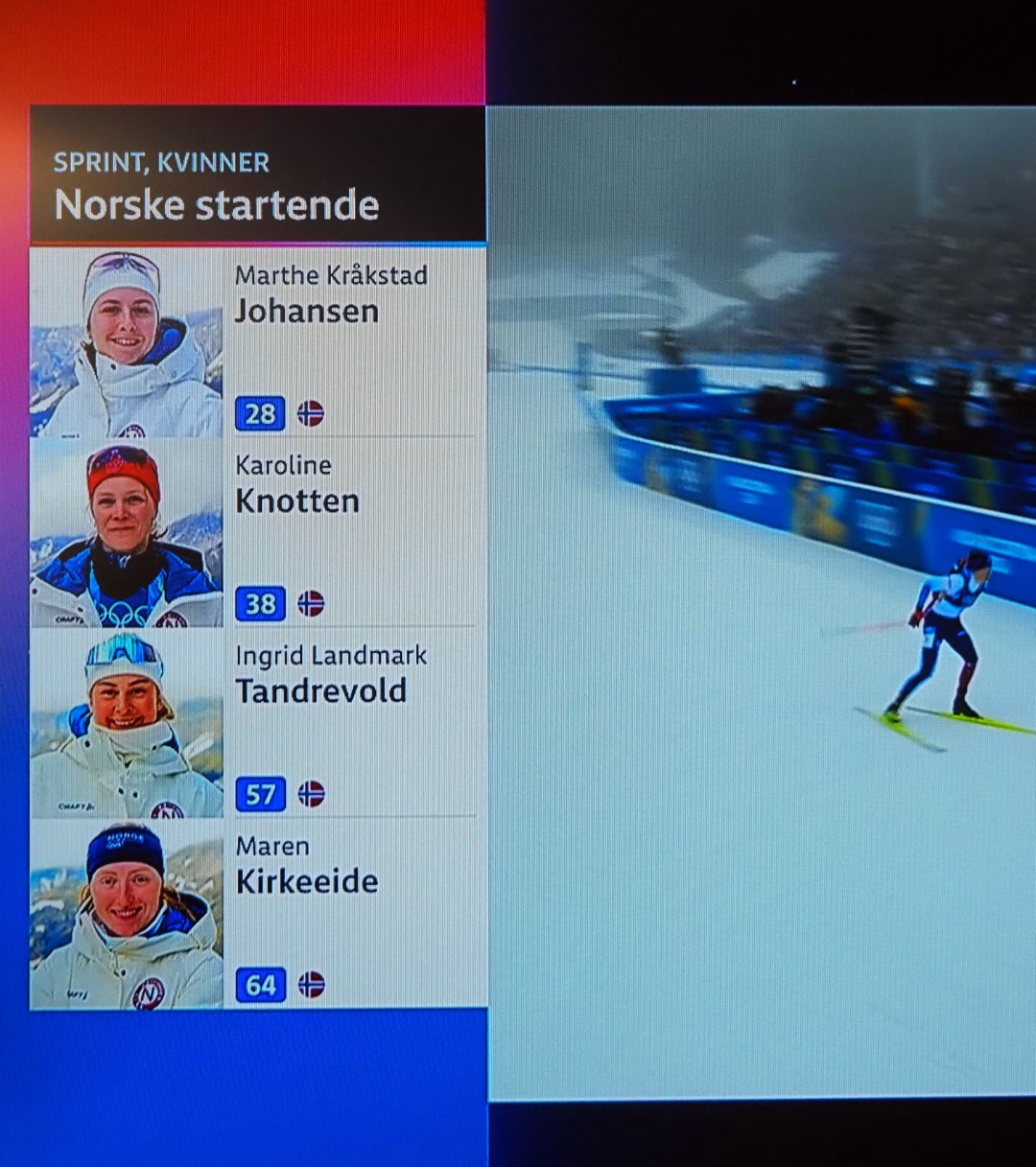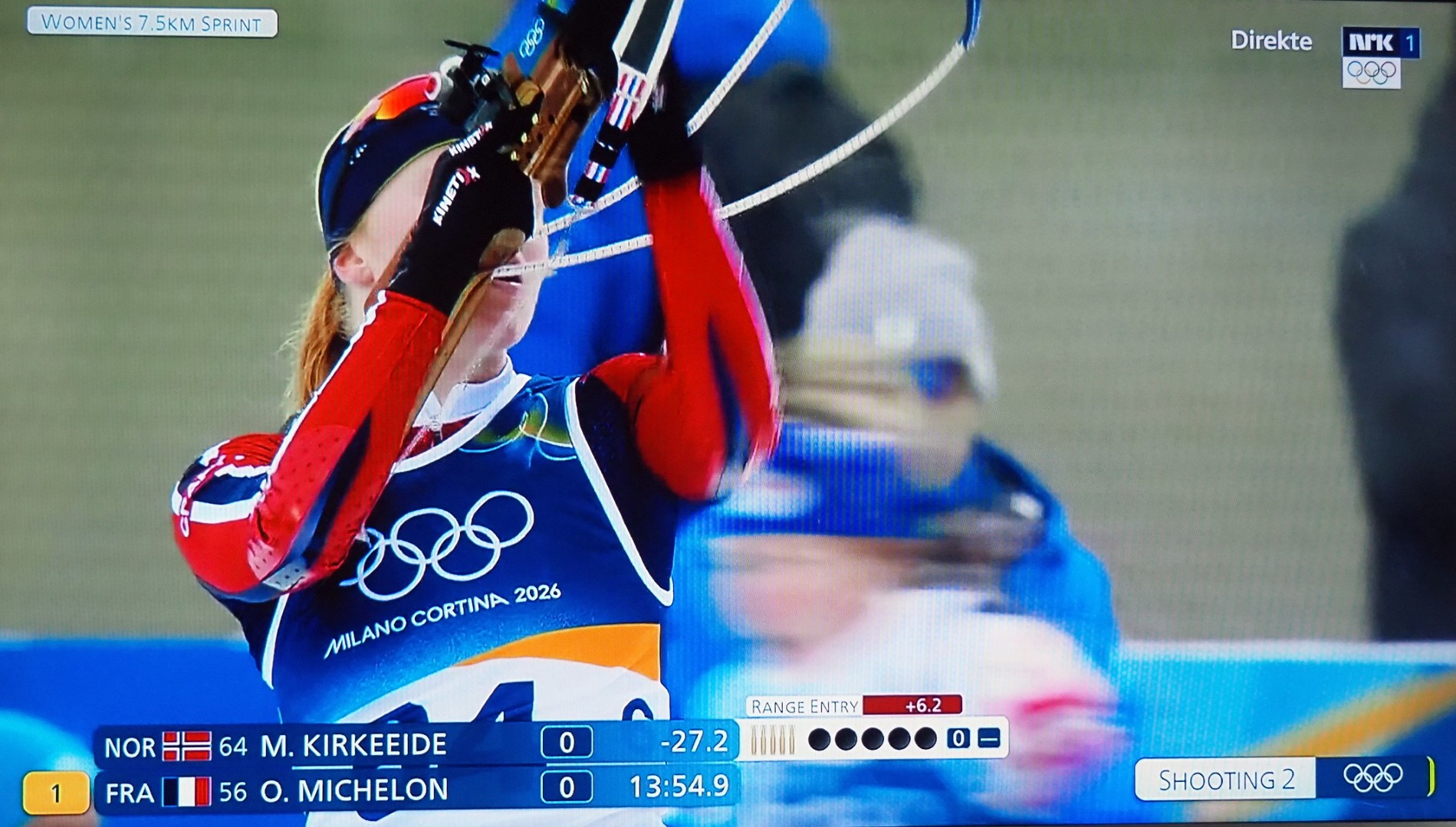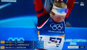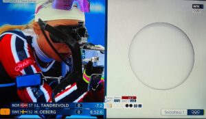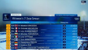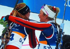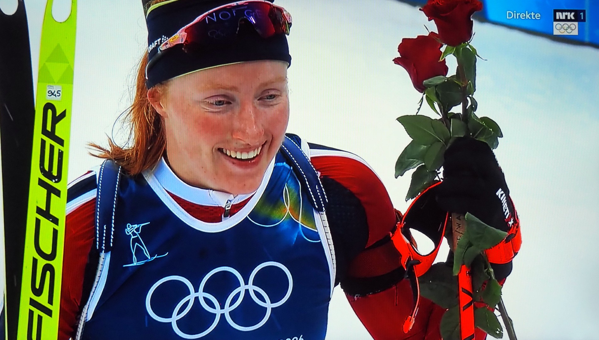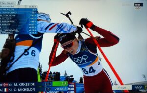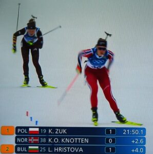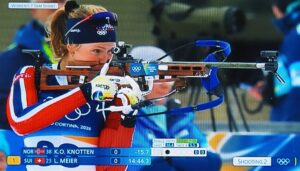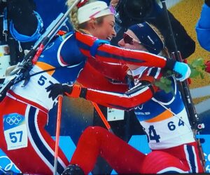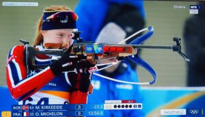 Op de 14e februari nemen vier Noorse dames deel aan 7,5 km sprint indivudeel met skischieten. 1 x liggend, 1 x staand schieten. 1 bom = strafronde. Zij met dat rode haar (niet zo gewoon in Noorwegen!) wint goud. Ik heb het over Maren Kirkeeide! Dat alles op Valentijsdag!