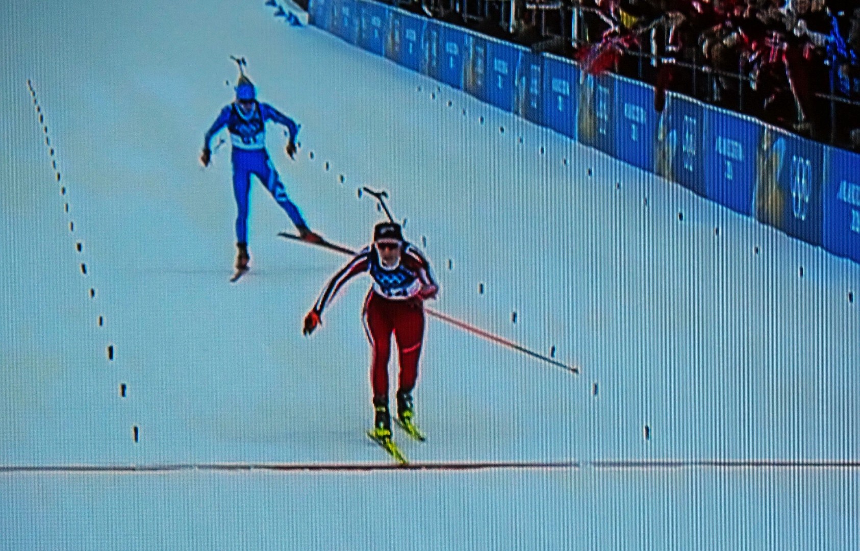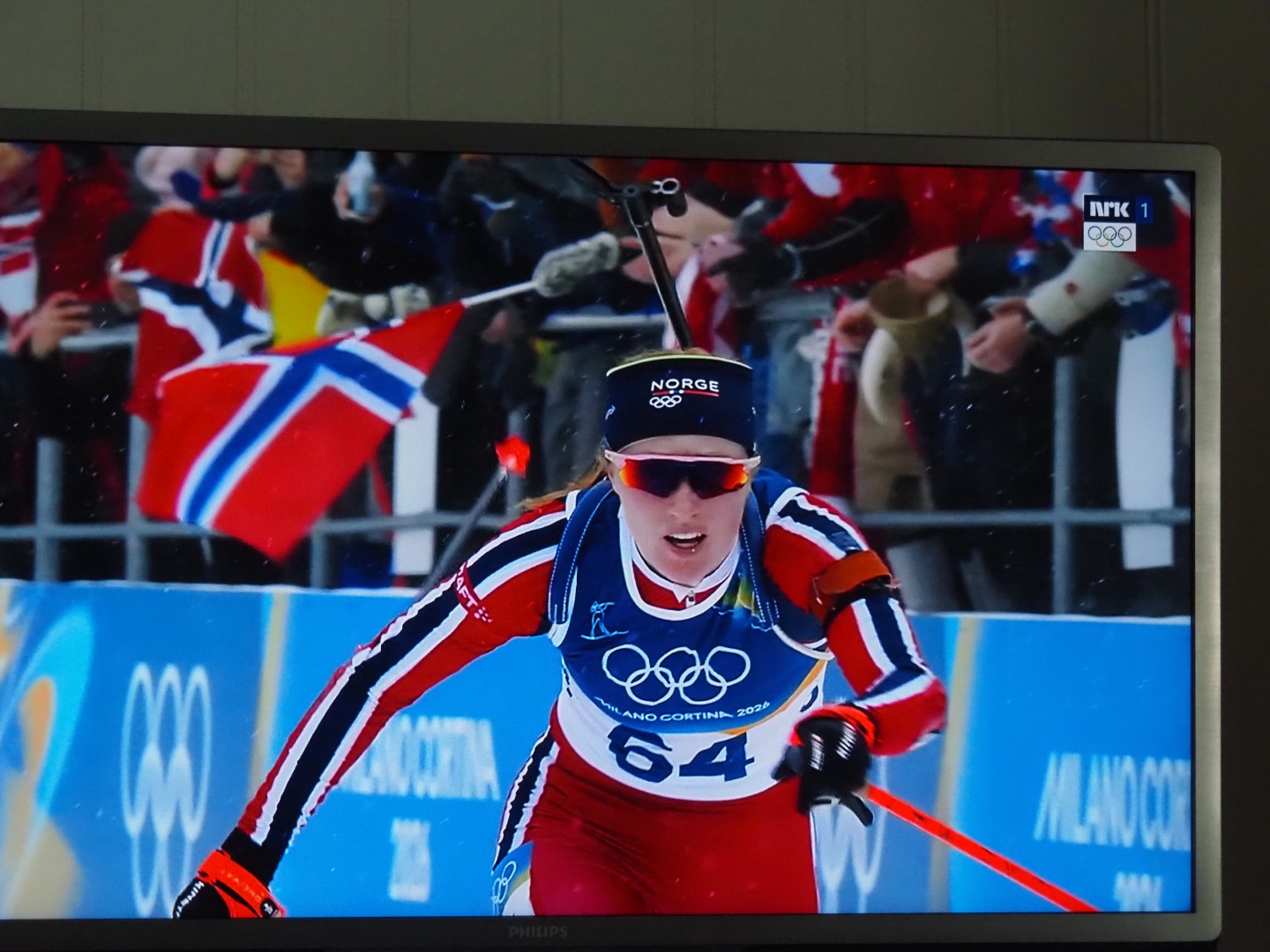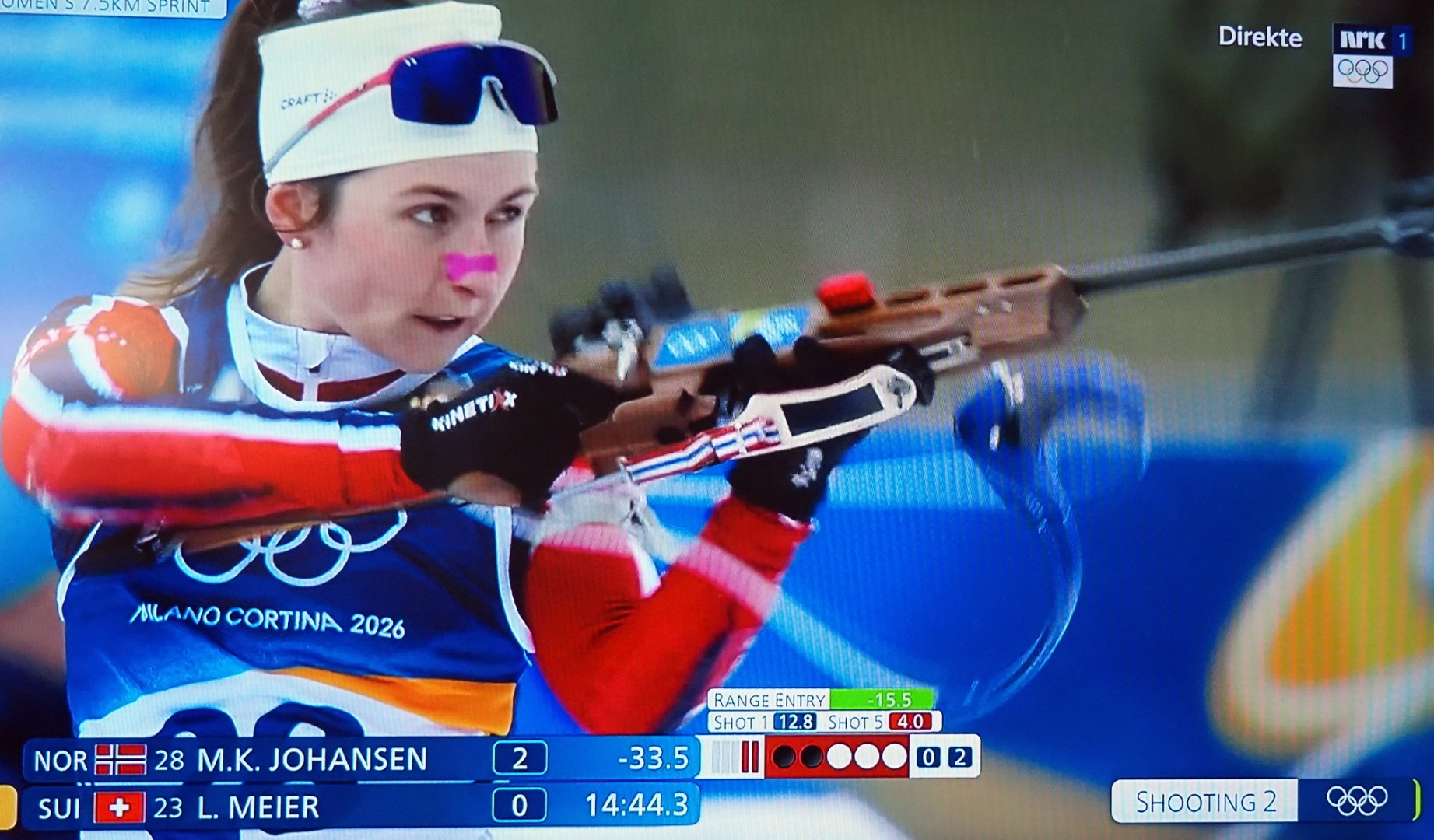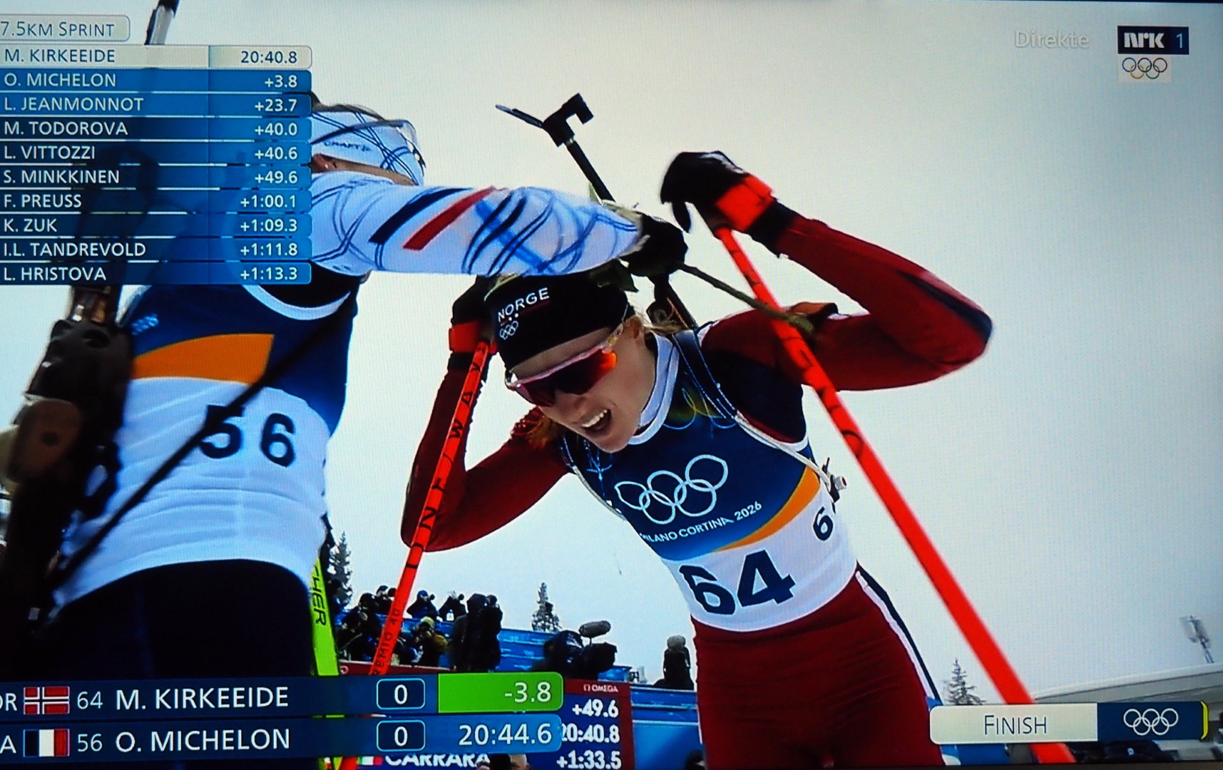 Op de 14e februari nemen vier Noorse dames deel aan 7,5 km sprint indivudeel met skischieten. 1 x liggend, 1 x staand schieten. 1 bom = strafronde. Zij met dat rode haar (niet zo gewoon in Noorwegen!) wint goud. Ik heb het over Maren Kirkeeide! Dat alles op Valentijsdag!
